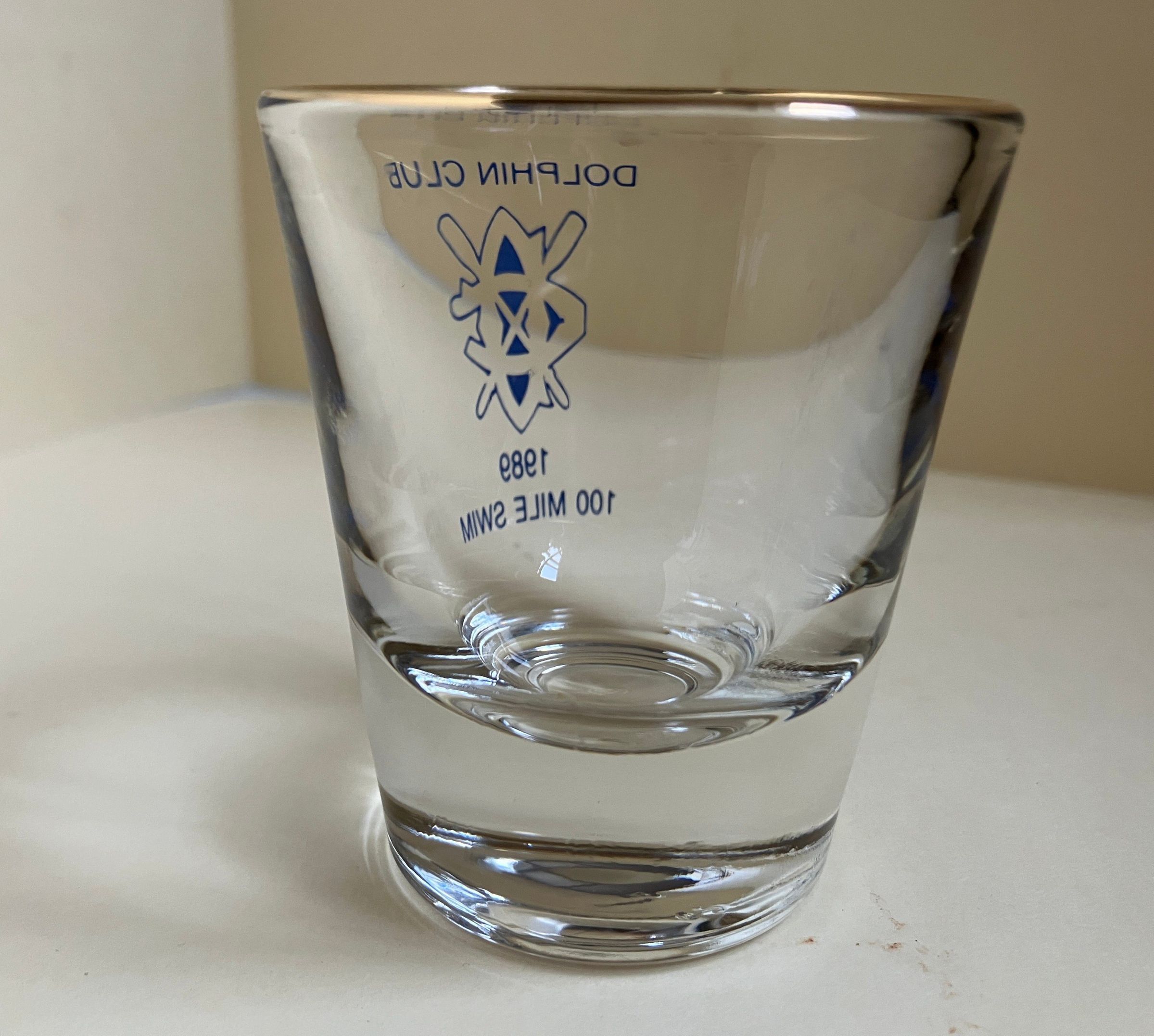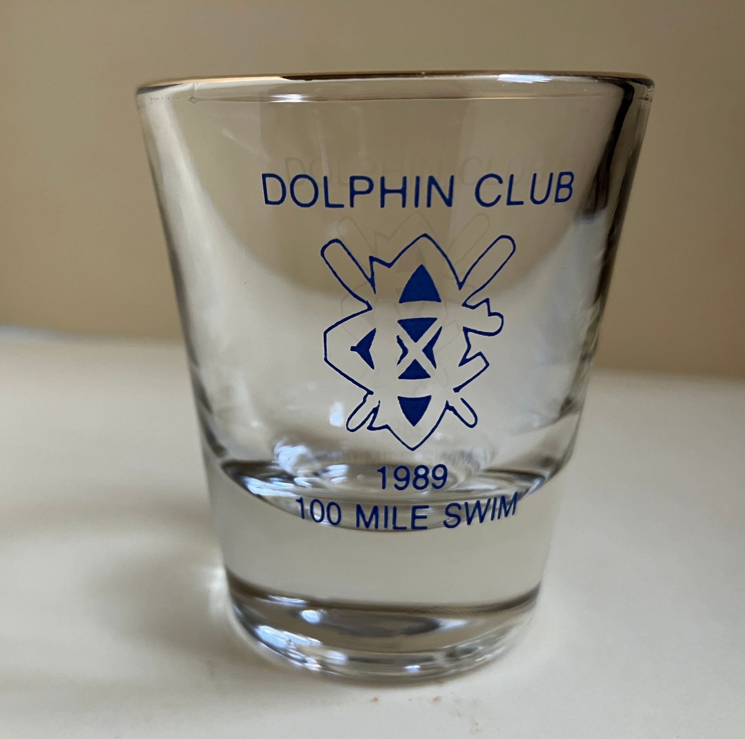 Shot glass, gold rim. Text in blue on one side: Dolphin Club - outlined crossed oars logo - 1989 - 100 Mile Swim