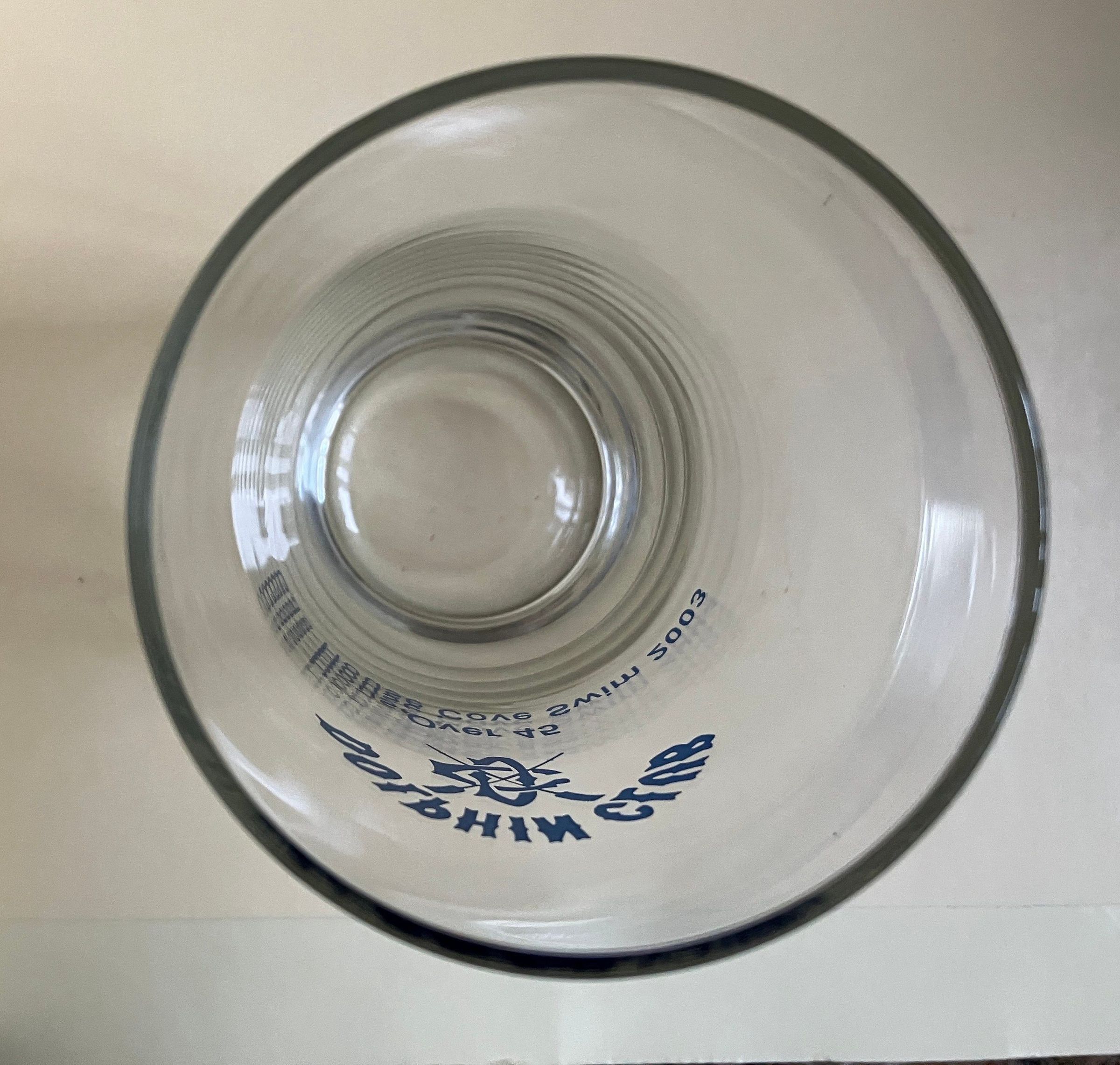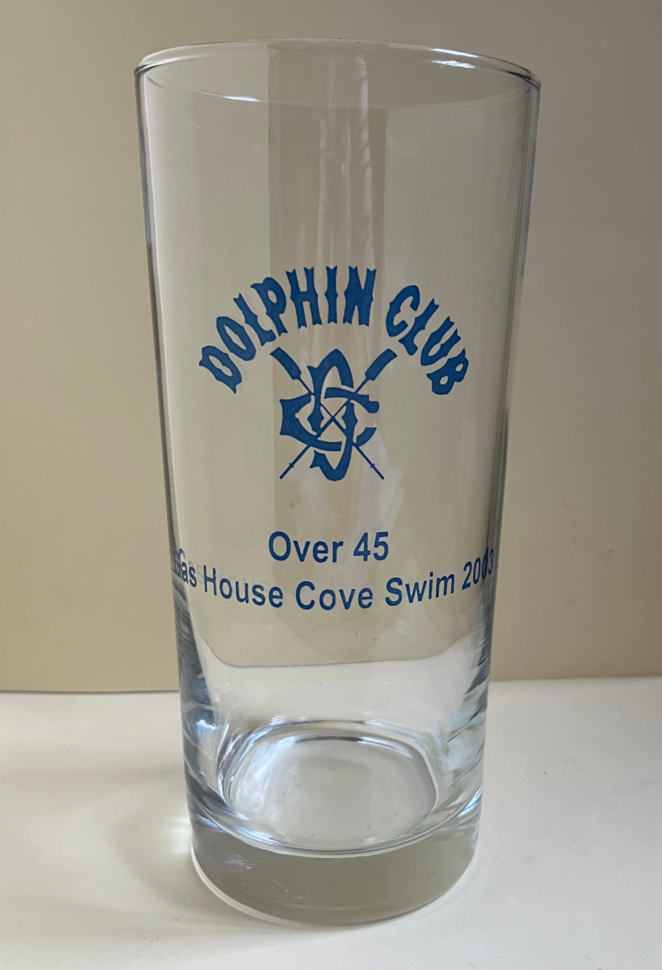 Tall highball style glass. Text in blue on one side: Dolphin Club - crossed oars logo - Over 45 - Gas House Cove Swim 2005
