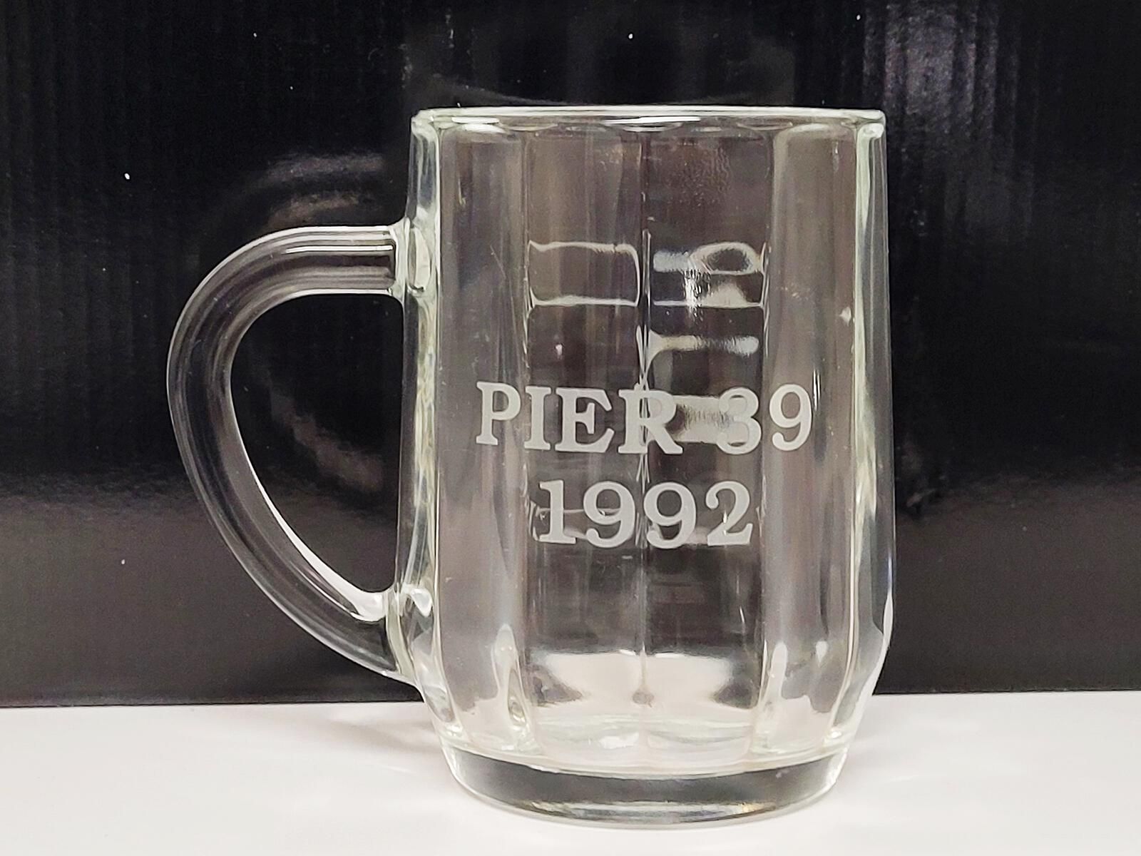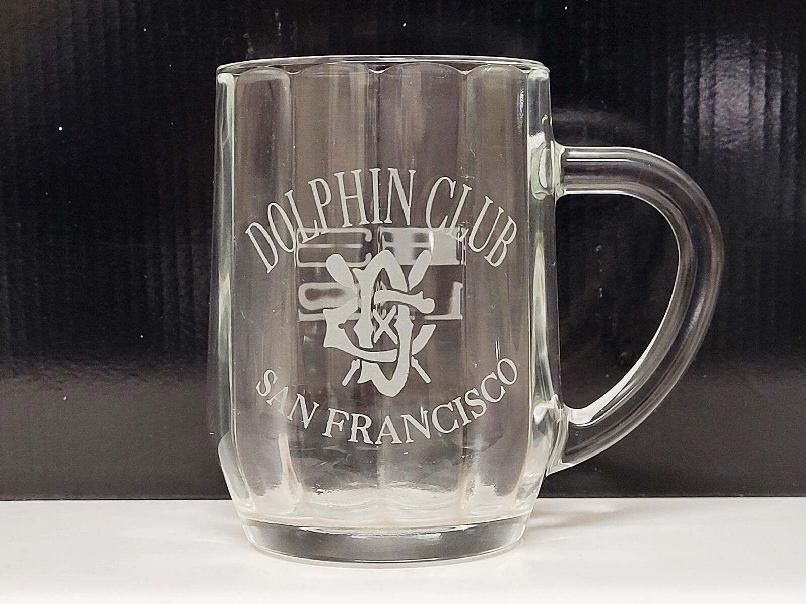 Small glass mug (4" H X 2-3/4" Diameter) with fluted sides. Engraved on front: Dolphin Club - crossed oars logo - San Francisco Engraved on back: Pier 39 -1992