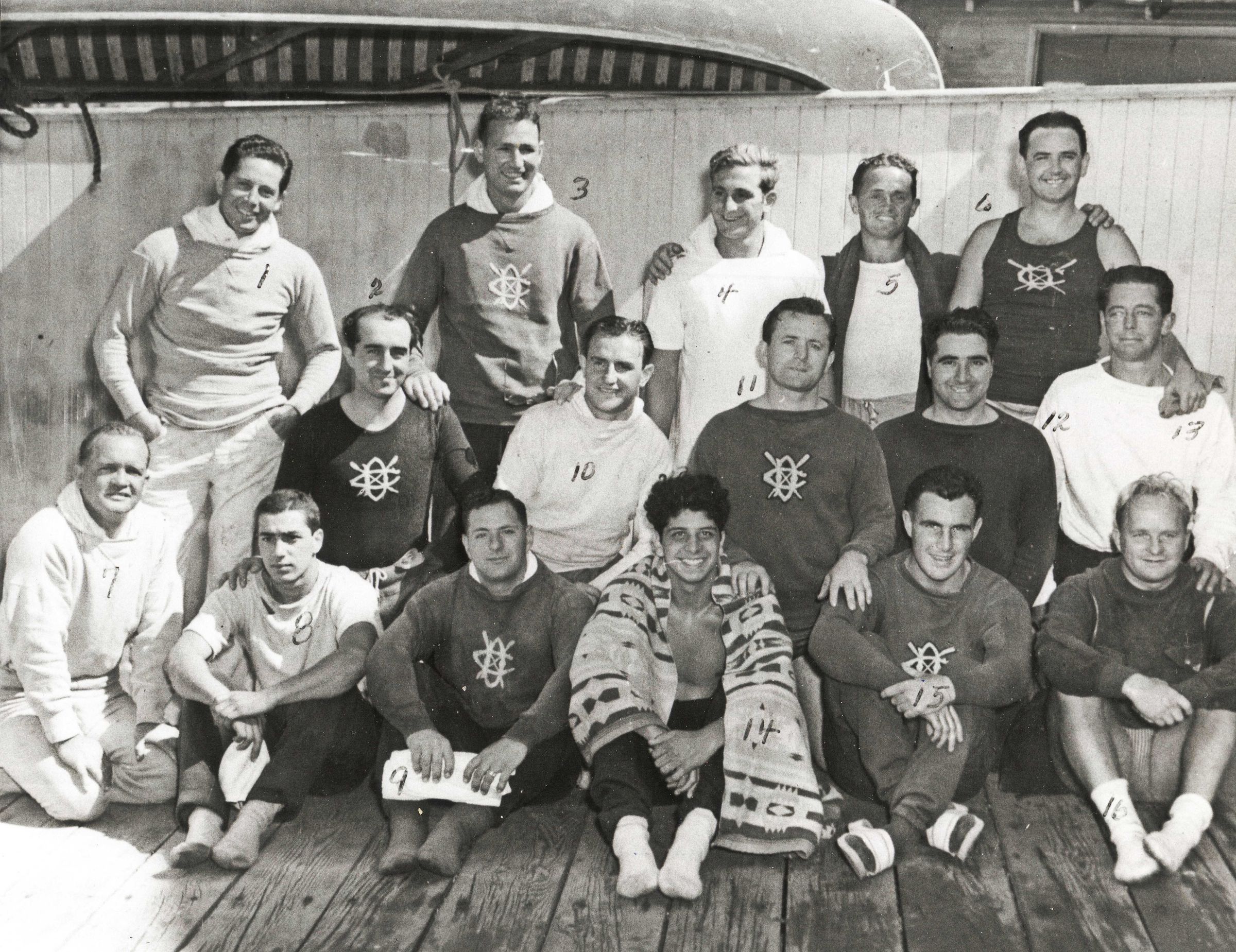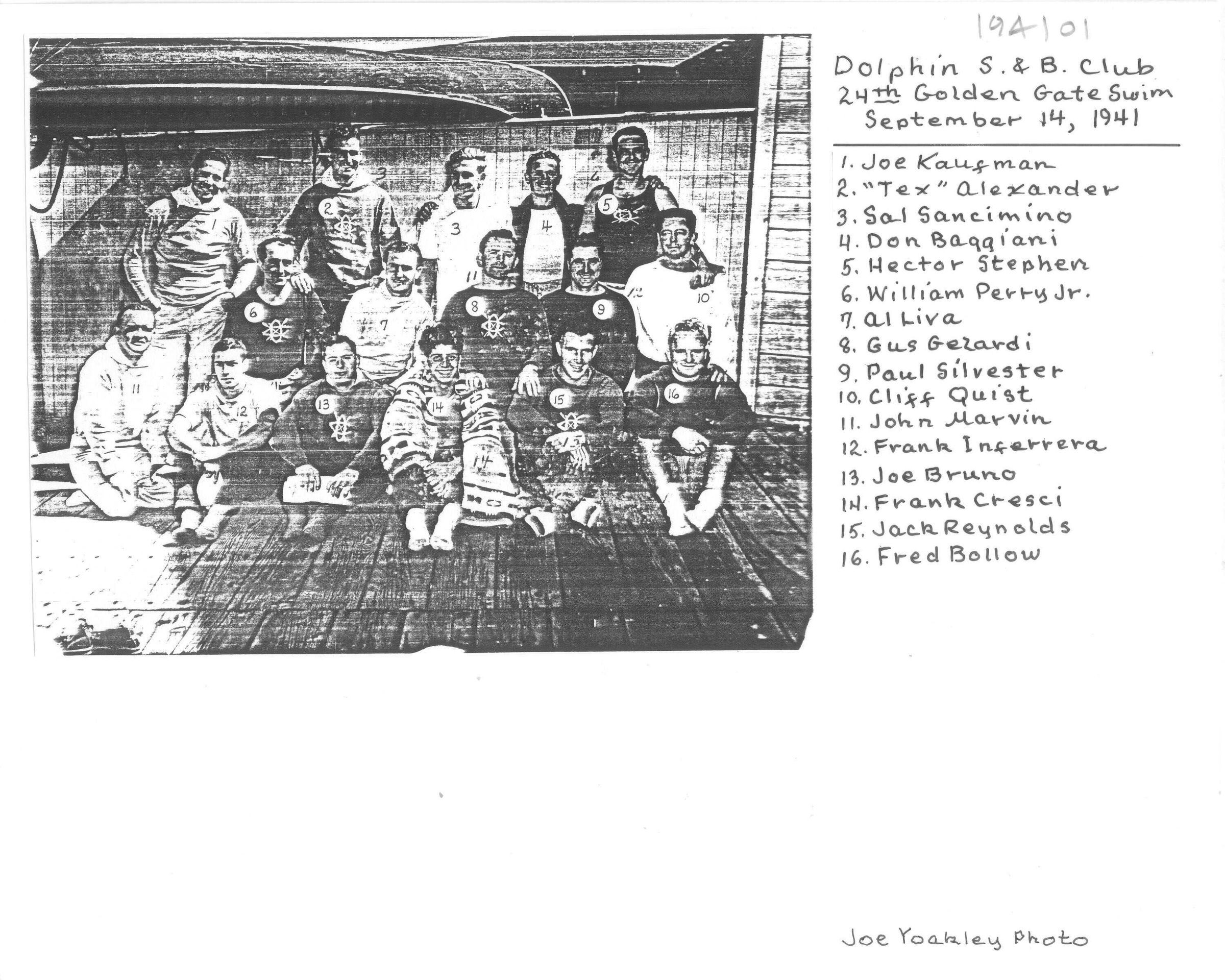 Swimmers in the photo: 1. Joe Kaufman 2. William Perry, Jr. 3. "Tex" Alexander 4. Sal Sancimino 5. Don Baggiani 6. Hector Stephen 7. John Marvin 8. Frank Inferrera 9. Joe Bruno 10. Al Liva 11. Gus Gelardi 12. Paul Silvester 13. Cliff Quist 14. Frank Cresci 15. Jack Reynolds 16. Fred BollowSubject Person or Organization