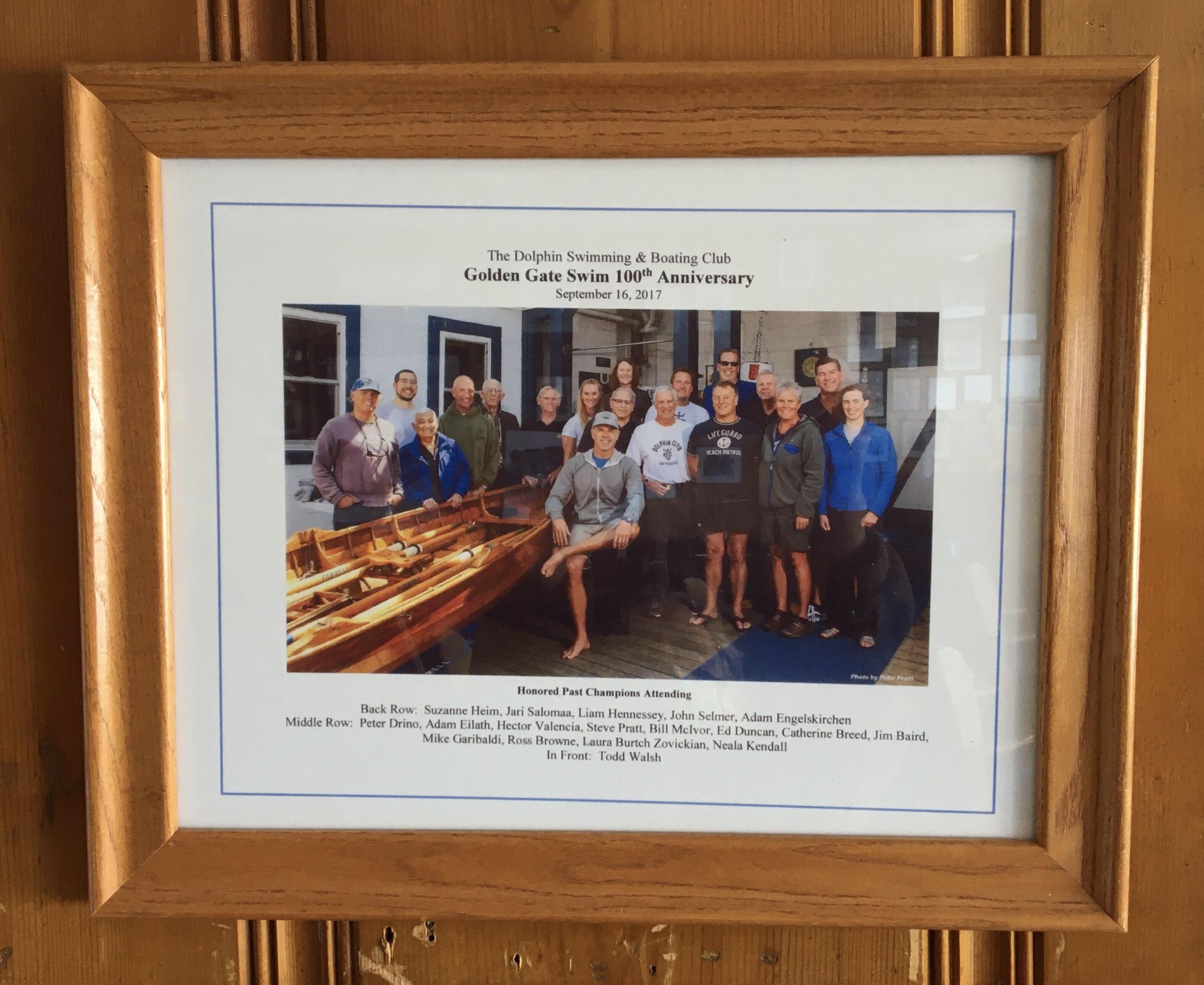 Framed color photo of 18 past winners of Dolphin Club Golden Gate Swim on the occasion of the 100th Anniversary of the swim. They are posing on deck outside of galley with the boat Chas. M. Farrell.