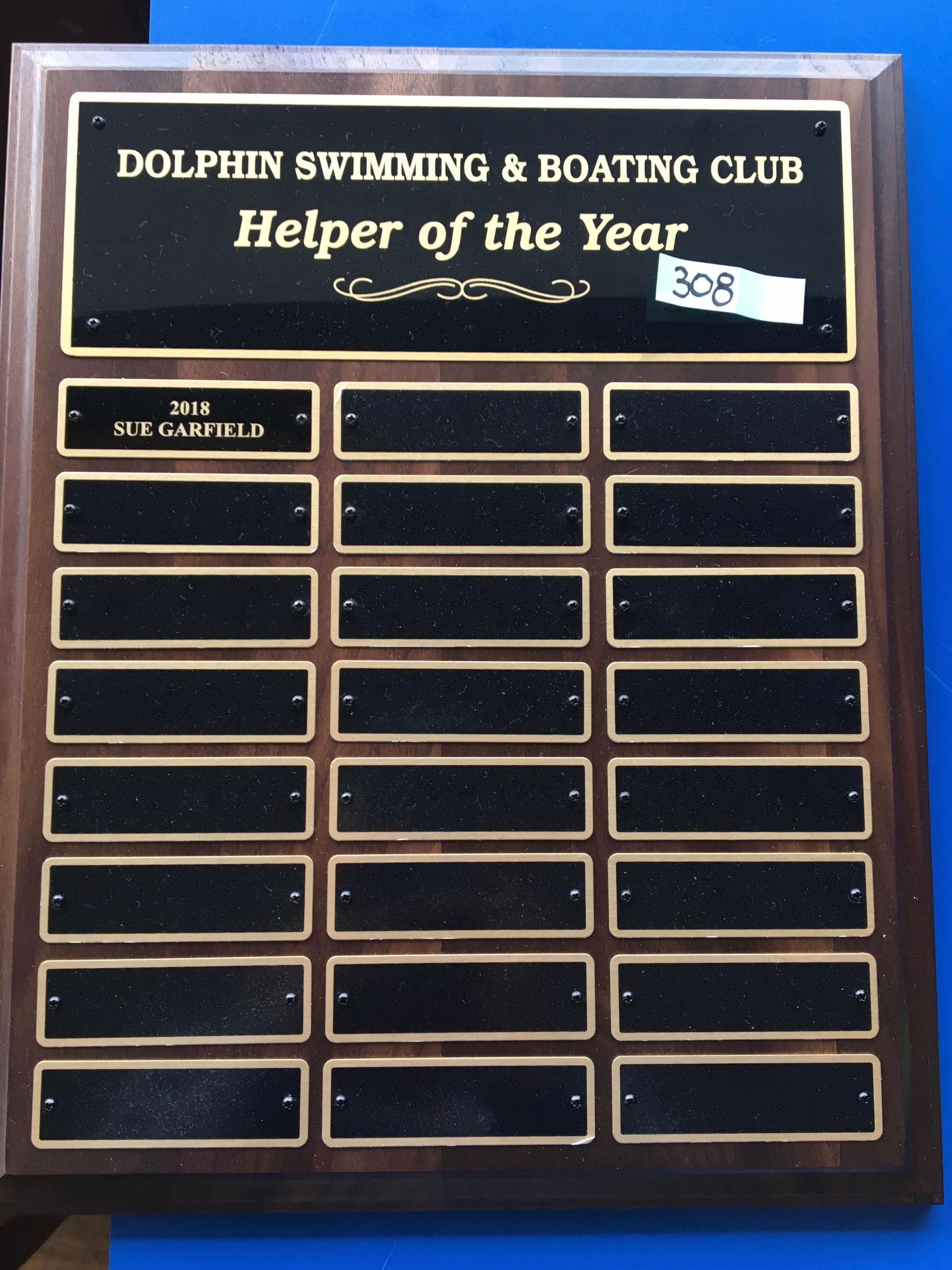 Dark brown wooden plaque with one large rectangle plate on top and three columns of 8 small name plates, total 24. Each plate is dark brown with gold edges. Text on large plate: "Dolphin Swimming & Boating Club - Helper of the Year."