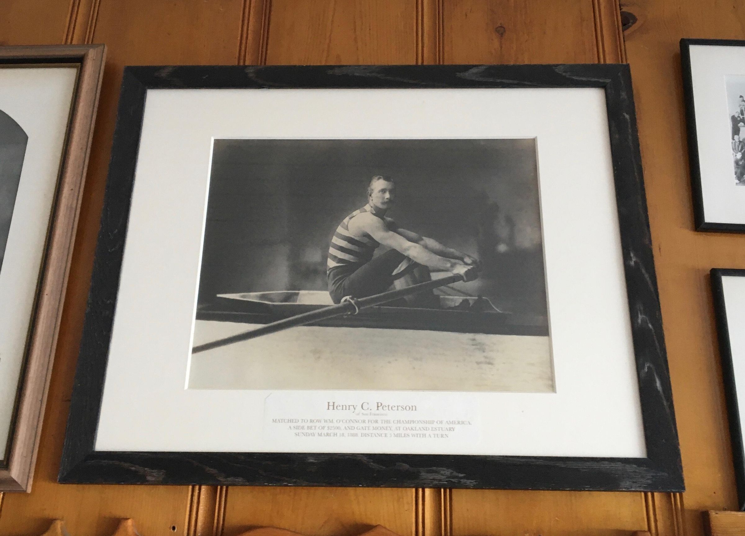 Caption: "Henry C. Peterson - (of San Francisco) - Matched to row Wm. O'Connor for the championship of America - A side bet of $2500, and gate money, at Oakland Estuary - Sunday, March 18, 1888. Distance of 3 miles with a turn."