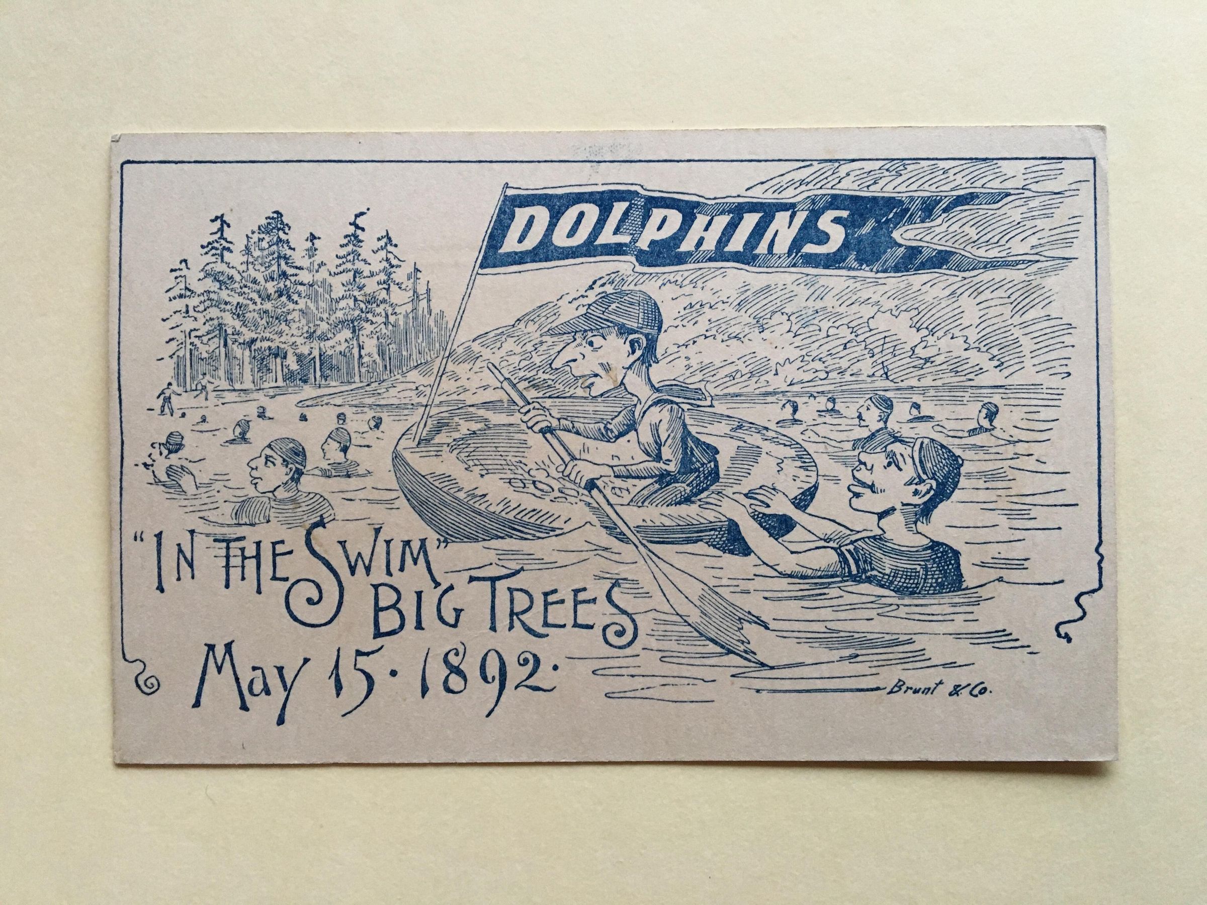 Two sided invitation post card. On one side is drawing of swimmers in water and one in a round boat with Dolphin flag. Blue ink on off white card.