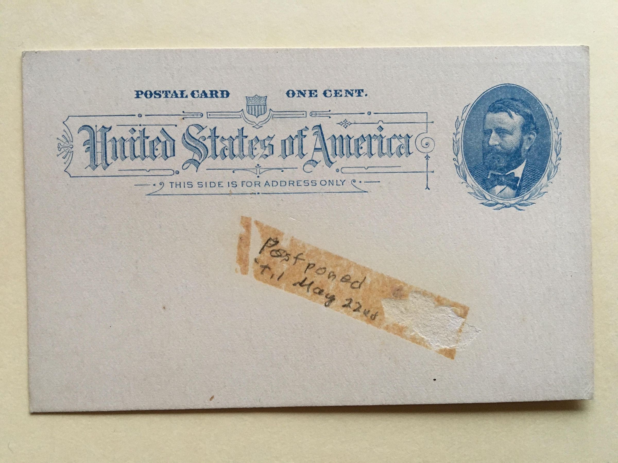 On other side is printed 1 cent USPS postcard and pencil note "postponed til May 22nd."