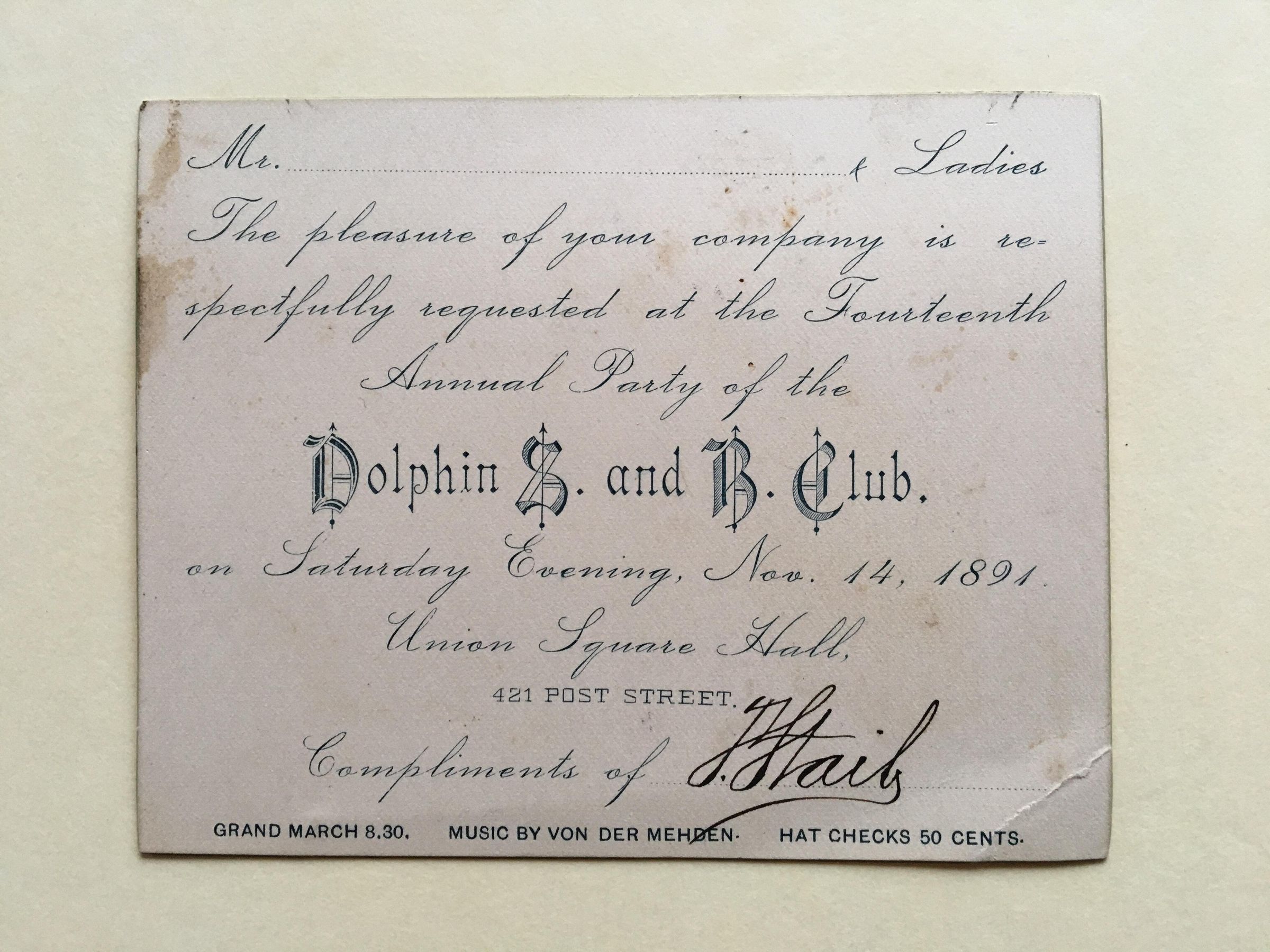 Invitation card for 14th Annual Party, November 14, 1891 at the Union Square Hall, 421 Post Street.