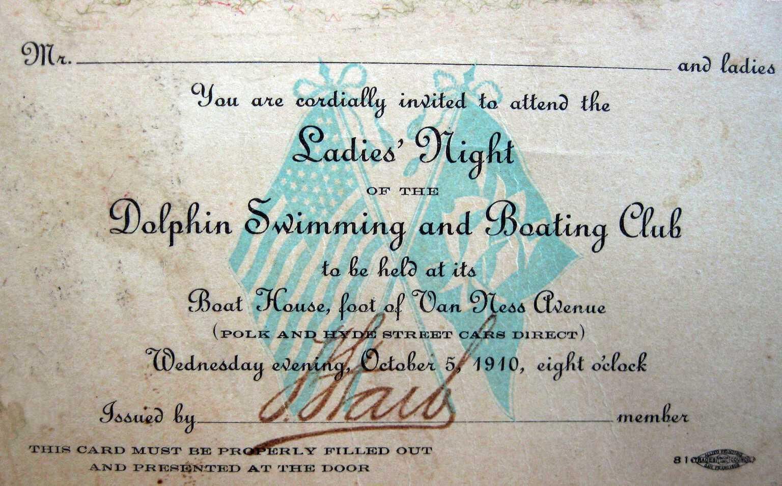 Invitation Card/Ticket for Ladies Night October 5, 1010 at Dolphin Club Boat House, foot of Van Ness Ave at 8pm.