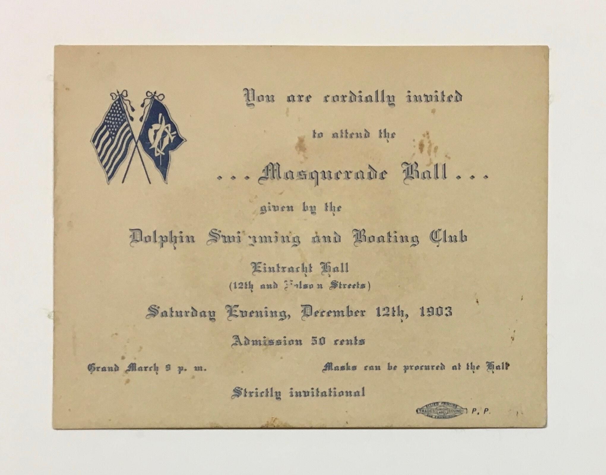 Invitation card to Dolphin Club Masquerade Ball on December 12, 1903. Venue is Eintracht Hall, 12th and Folsom Streets. Admission 50 cents.