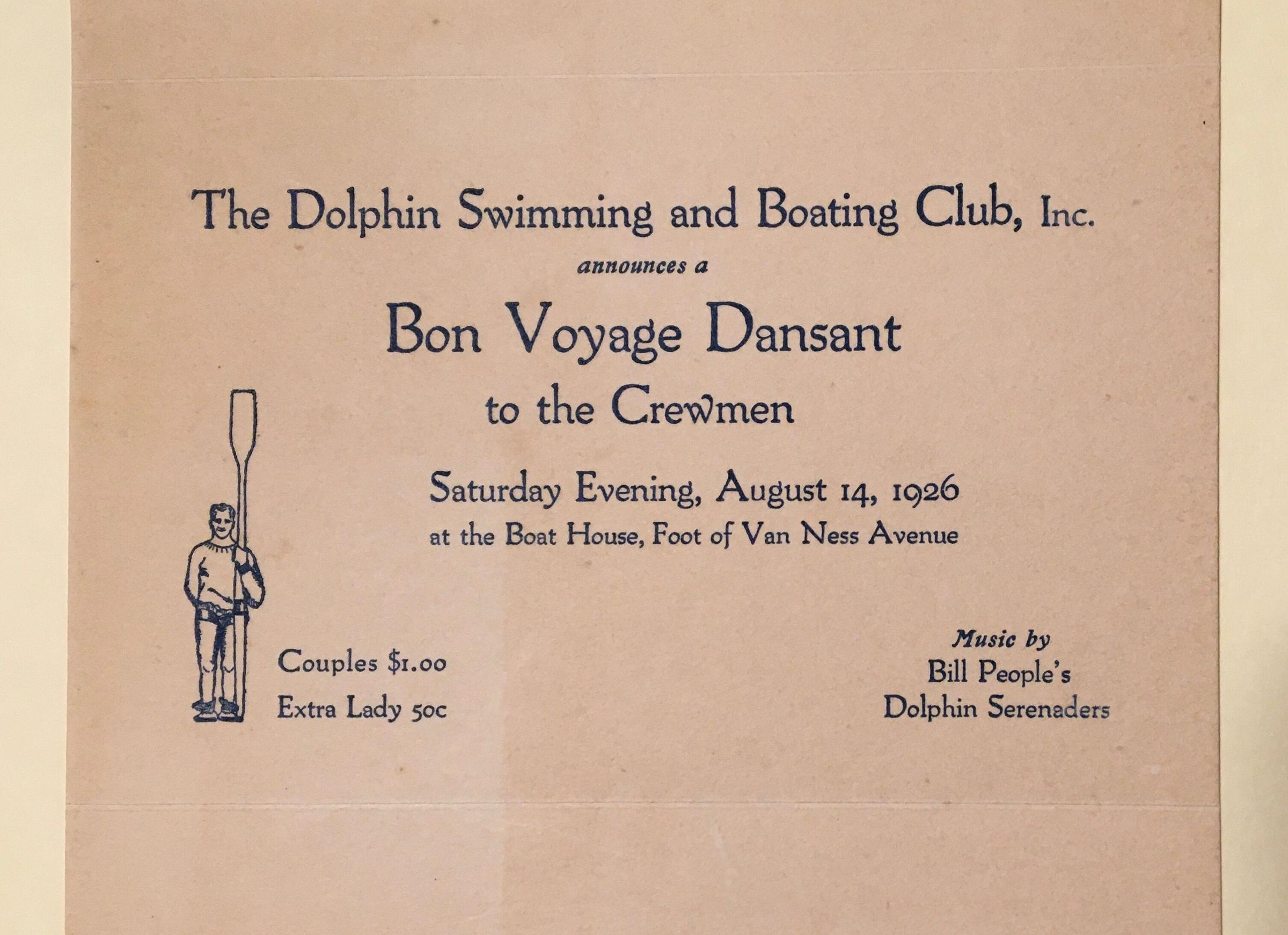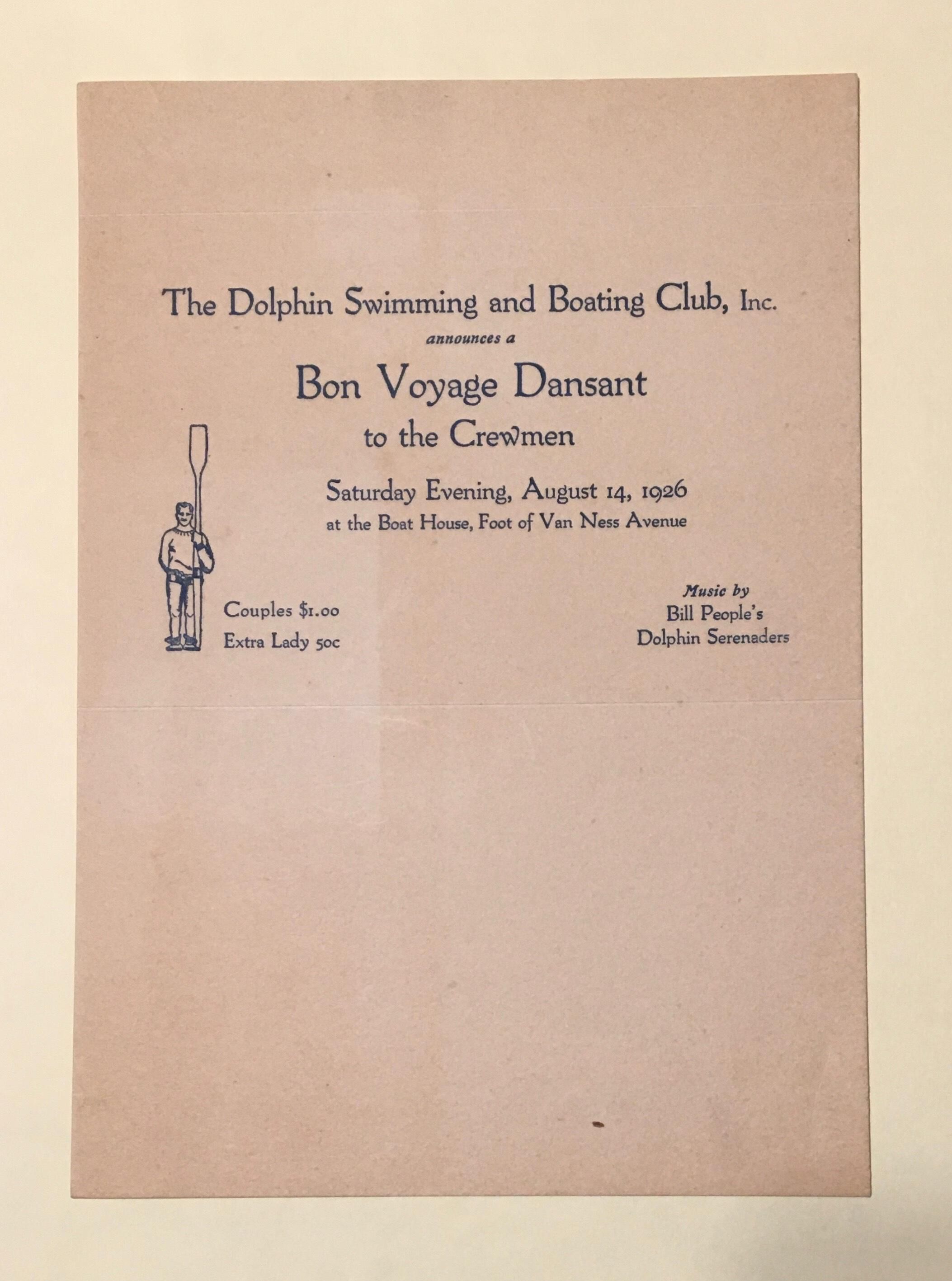 Invitation to "Bon Voyage Dansant to the Crewmen" on August 14, 1926 at the Dolphin boat house, still at Foot of Van Ness Avenue. Couples $1.00, Extra Lady 50 cents. Music by Bill People's Dolphin Serenaders.Archive Details