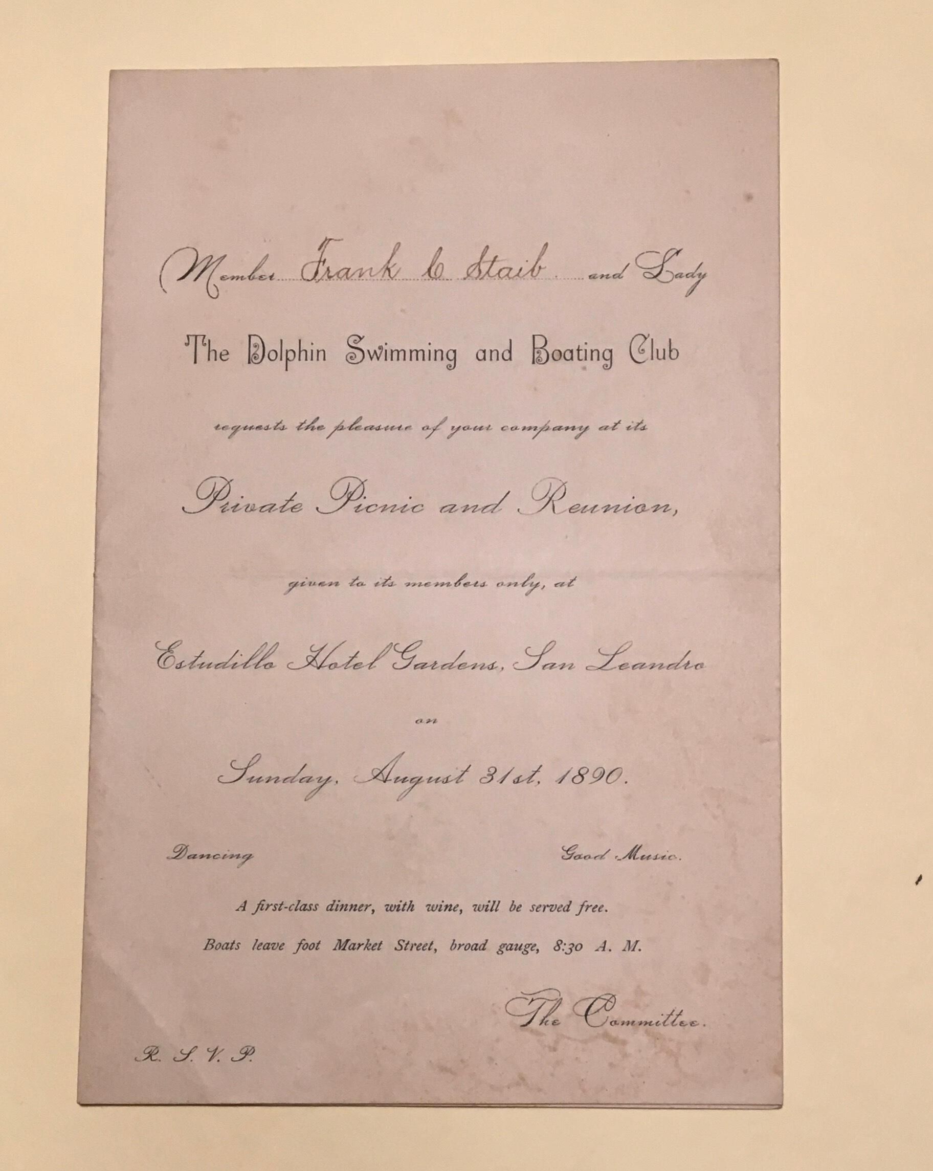 Invitation card to club "Private Picnic and Reunion" to take place at the Estudillo Hotel Gardens, San Leandro on August 31, 1890.