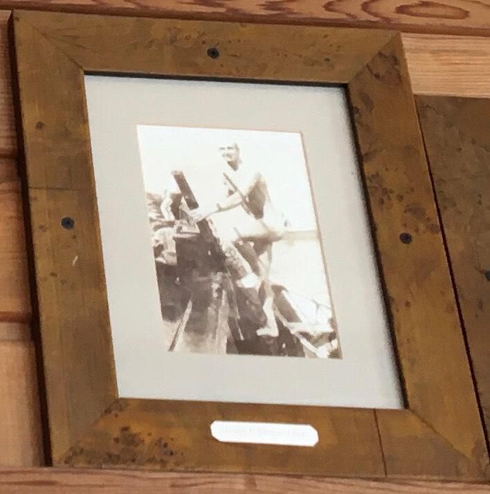 Faded photo of a swimmer a ladder coming on to boat after swim. Rustic wooden frame, screwed to the wall.