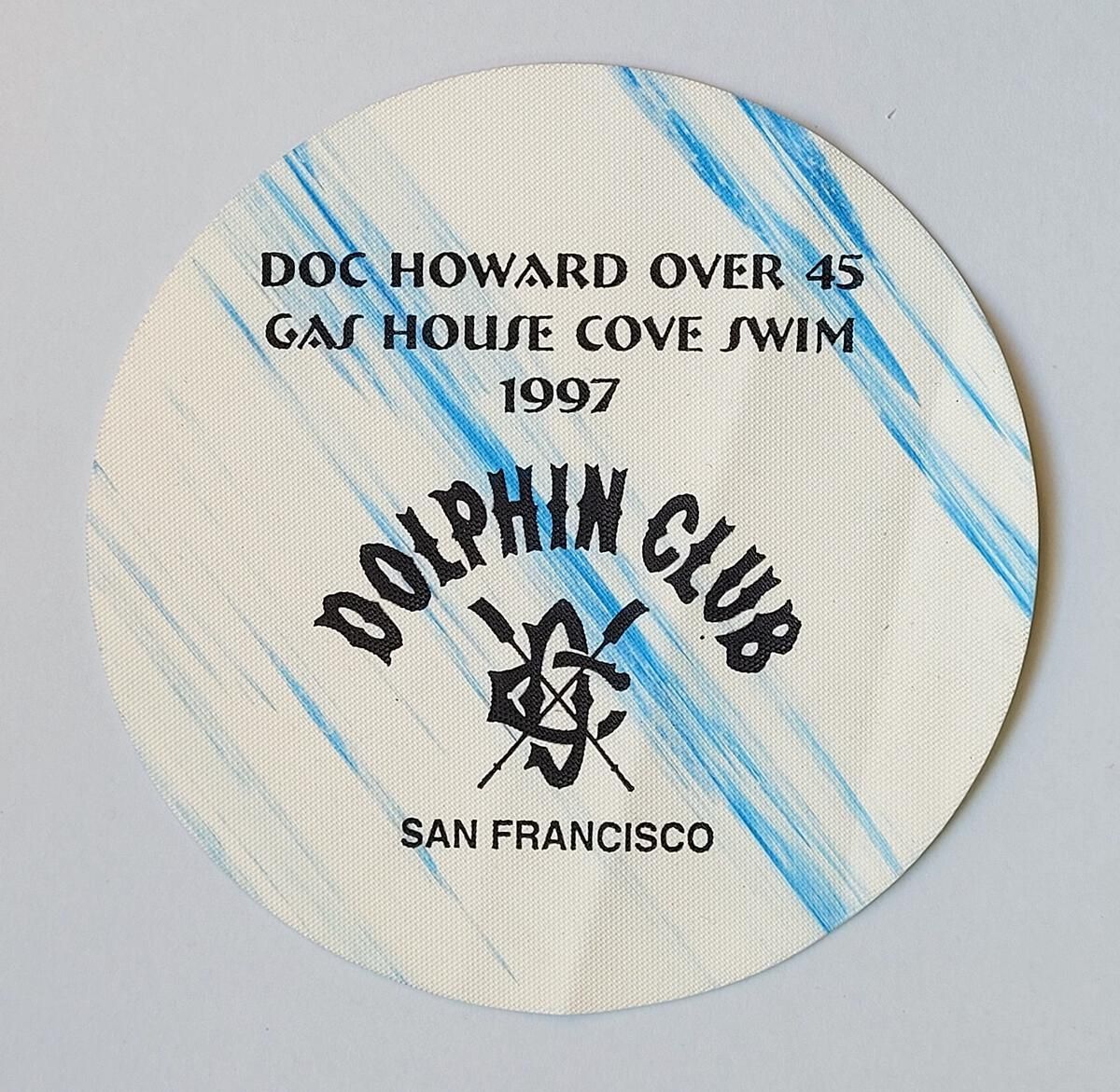 Rubber disc to use as gripper to open jar lids. White with several diagonal blue streaks across it and the Dolphin Club name and logo. Trinket for the 1997 Doc Howard Over 45 Gas House Cove Swim