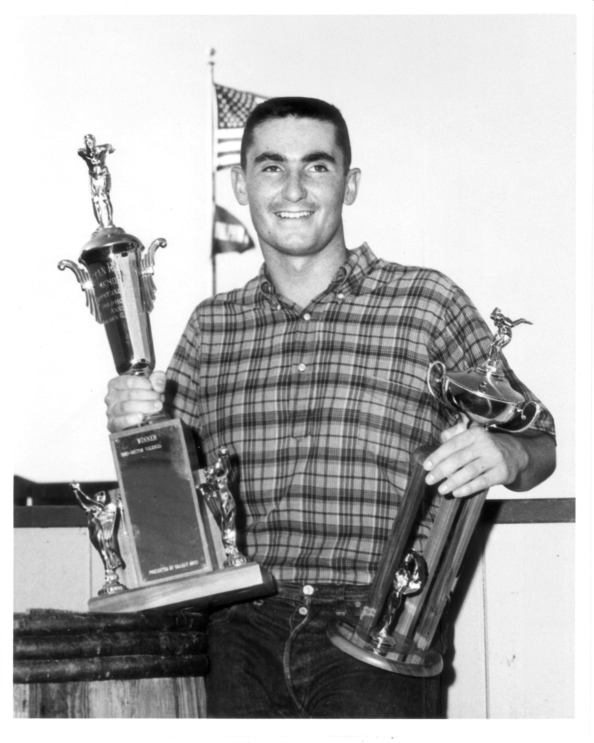 Man holding trophies See Artifact 209 which includes framed copy of this photo