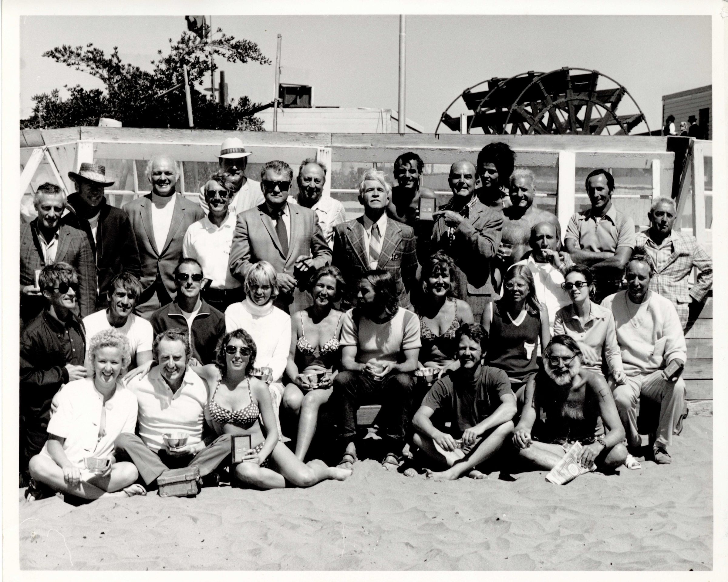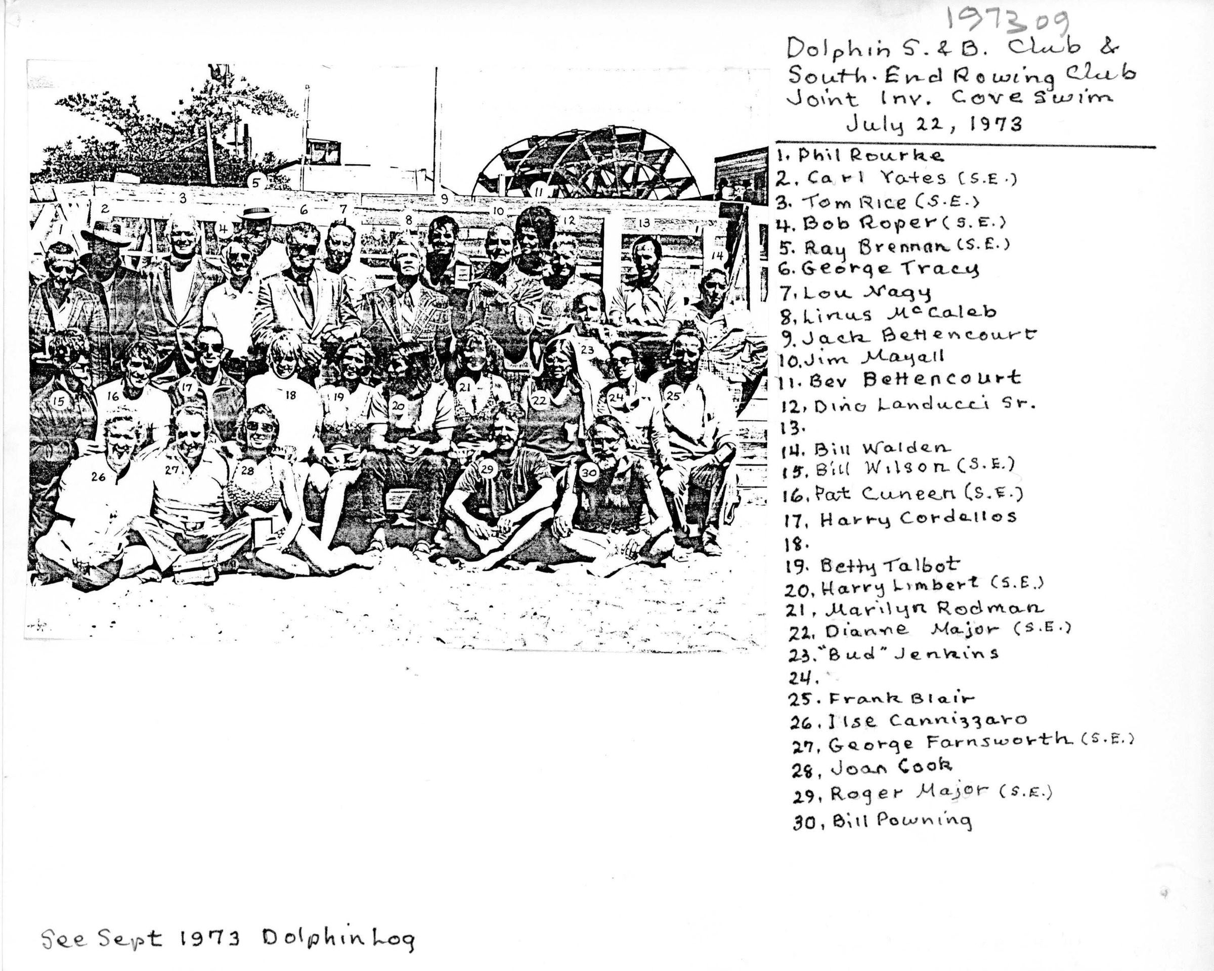 Dolphin & South End Clubs joint Cove swim. Some shown are Phil Rourke, Tom Rice, Bob Roper, George Tracy, Lou Nagy, Linus McCaleb, Jim Mayall, Pat Cuneen, Marilyn Rodman, Harry Cordellos, Betty Talbot, Diane Major, Bud Jenkins, George Farnsworth, Joan Brown Cook, Roger Major.Subject Person or Organization