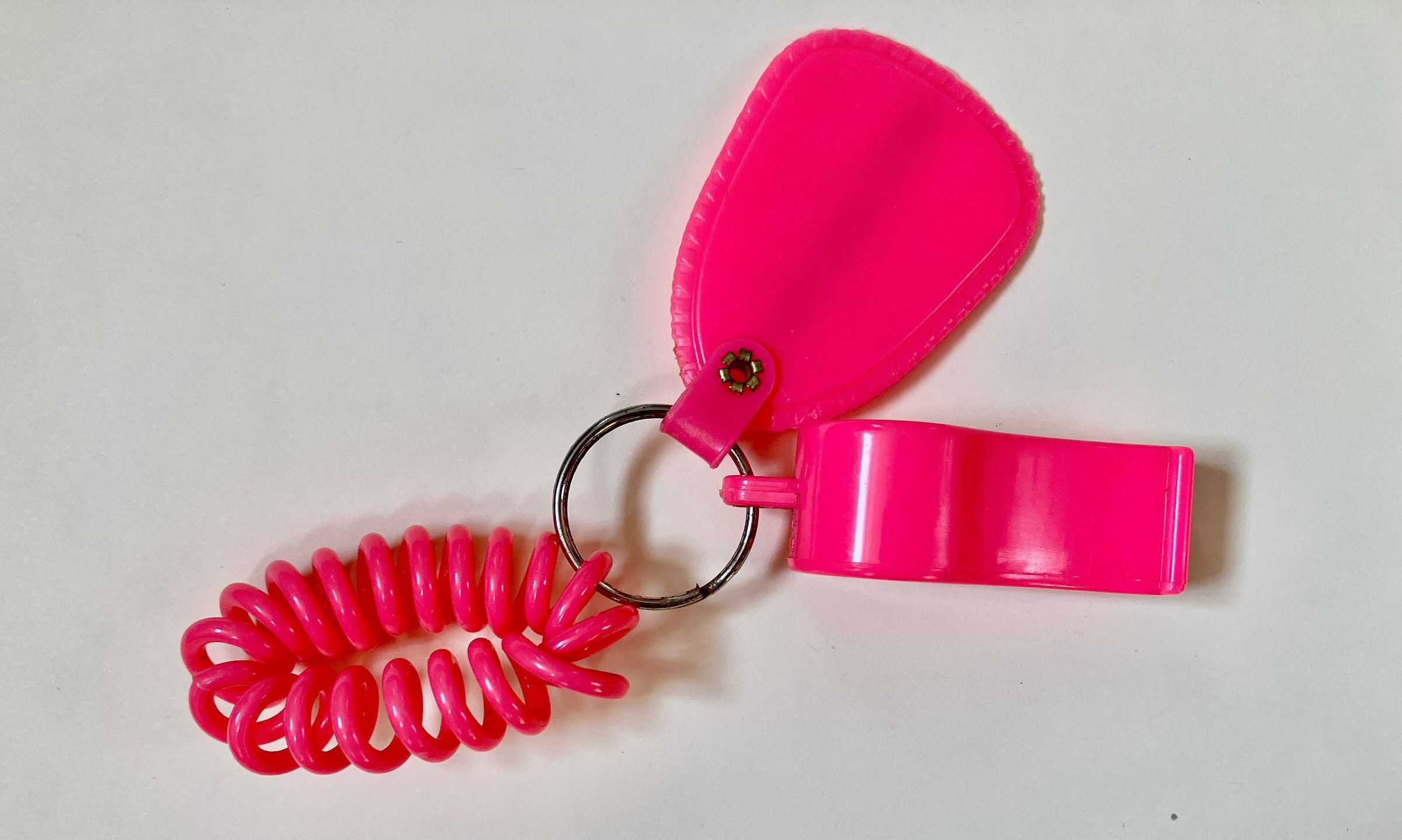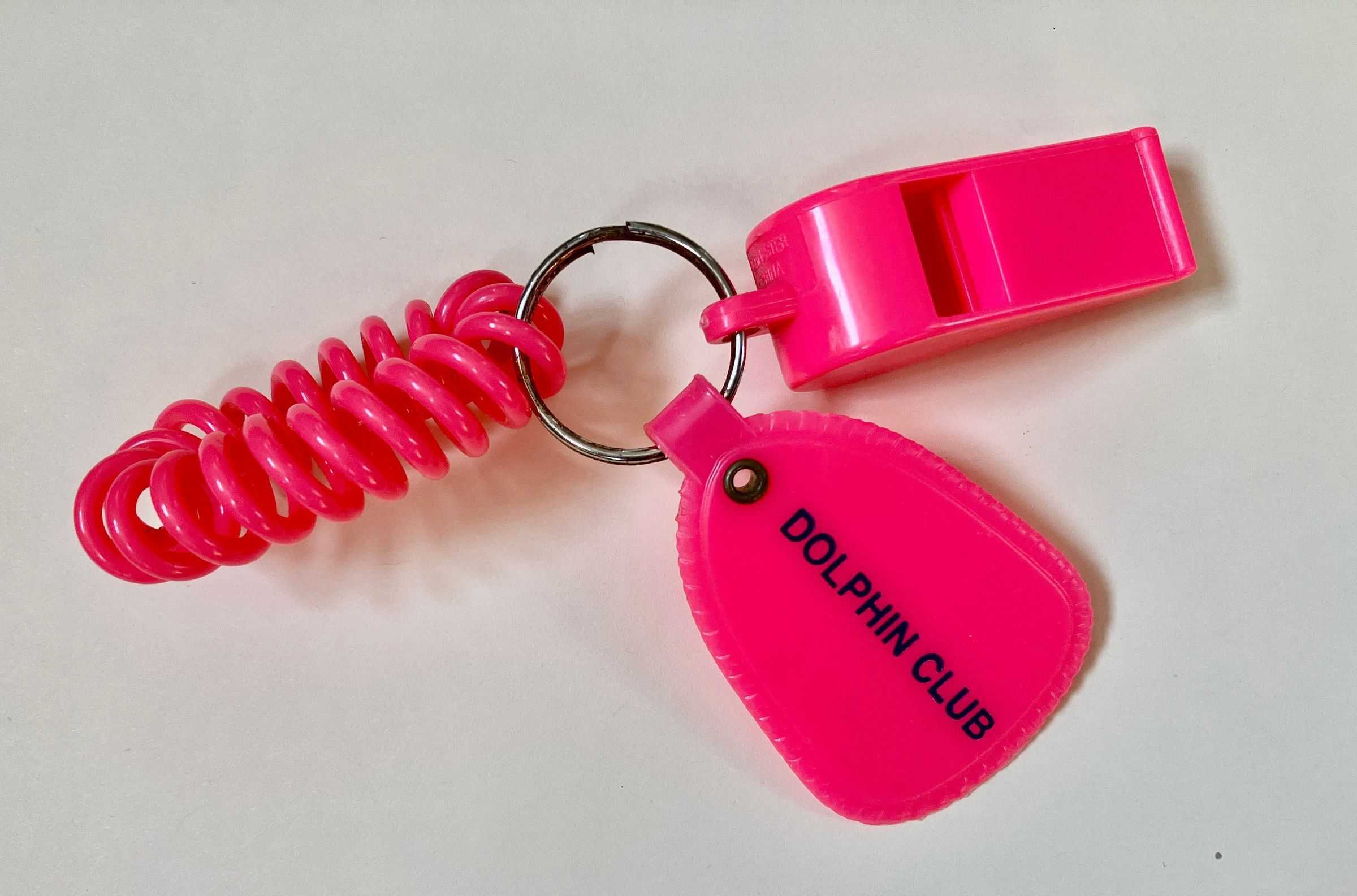 Metal key ring with three pink plastic attachments: one whistle, one coil wristband, and one oval tab.