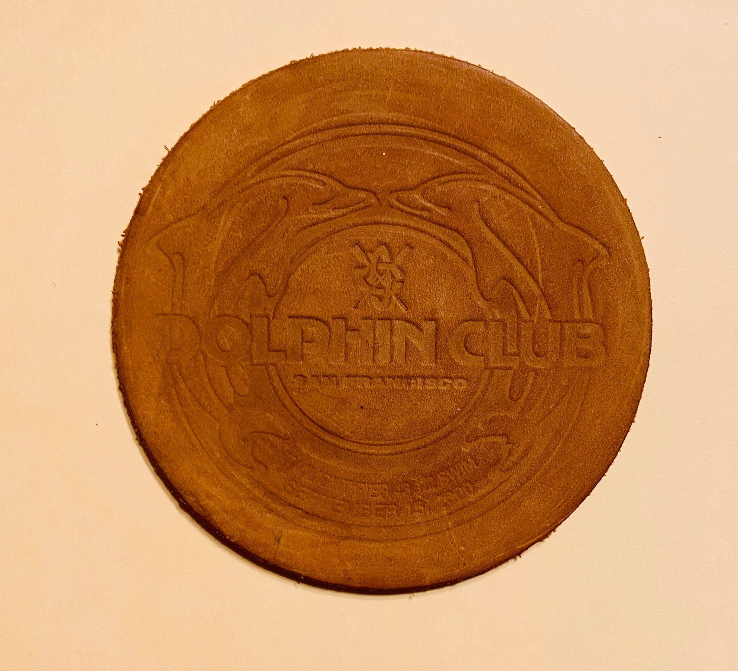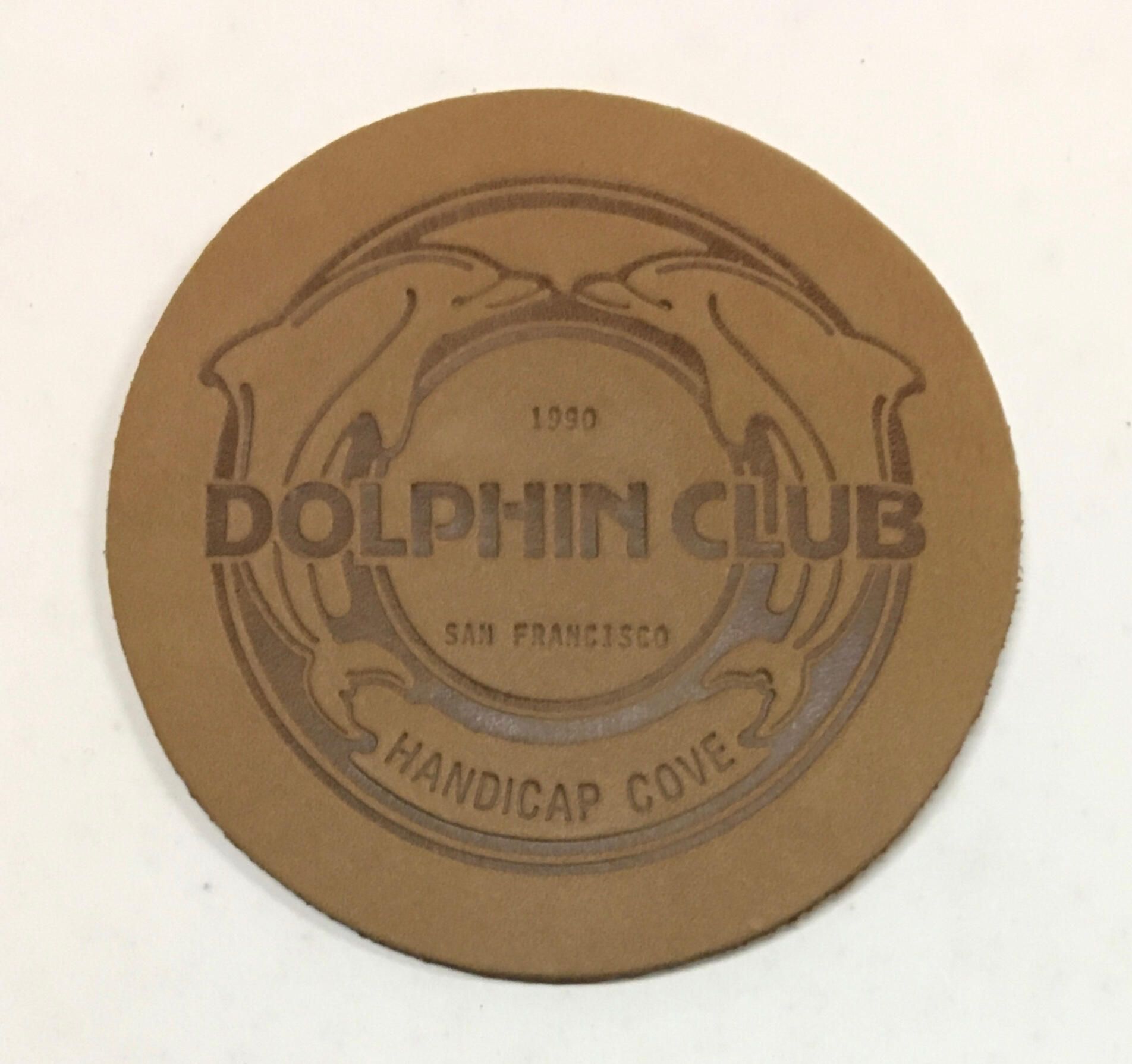 3. 1988 Doc Howard Over 45: Same design/size as 1983 Pier 4. 1990 HandicapCove Swim: Brown leather coaster with round two dolphin border design. Diameter 4 in.