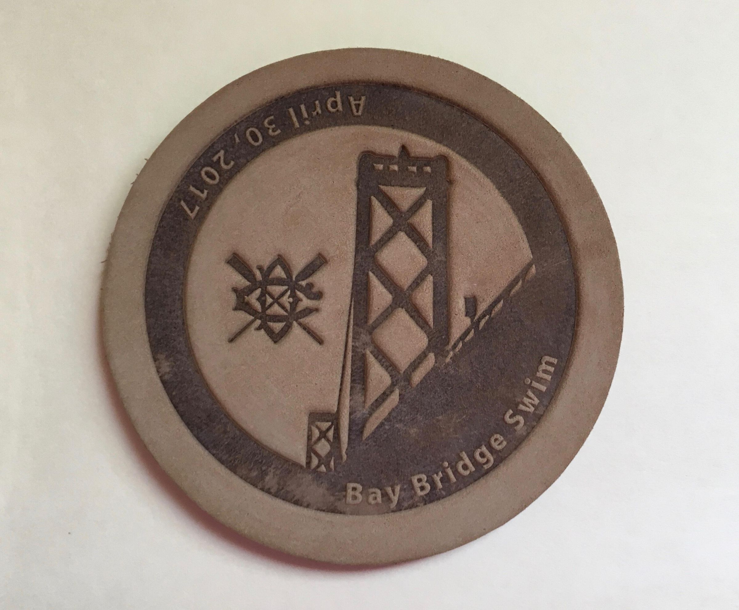 6. 2017 Bay Bridge: Brown leather coaster with view of two Bay Bridge towers from below with DC/corssed oars inside of border. "Bay Bridge Swim" on bottom border, "April 30, 2017" on top of border. Diameter 3 3/4 in.