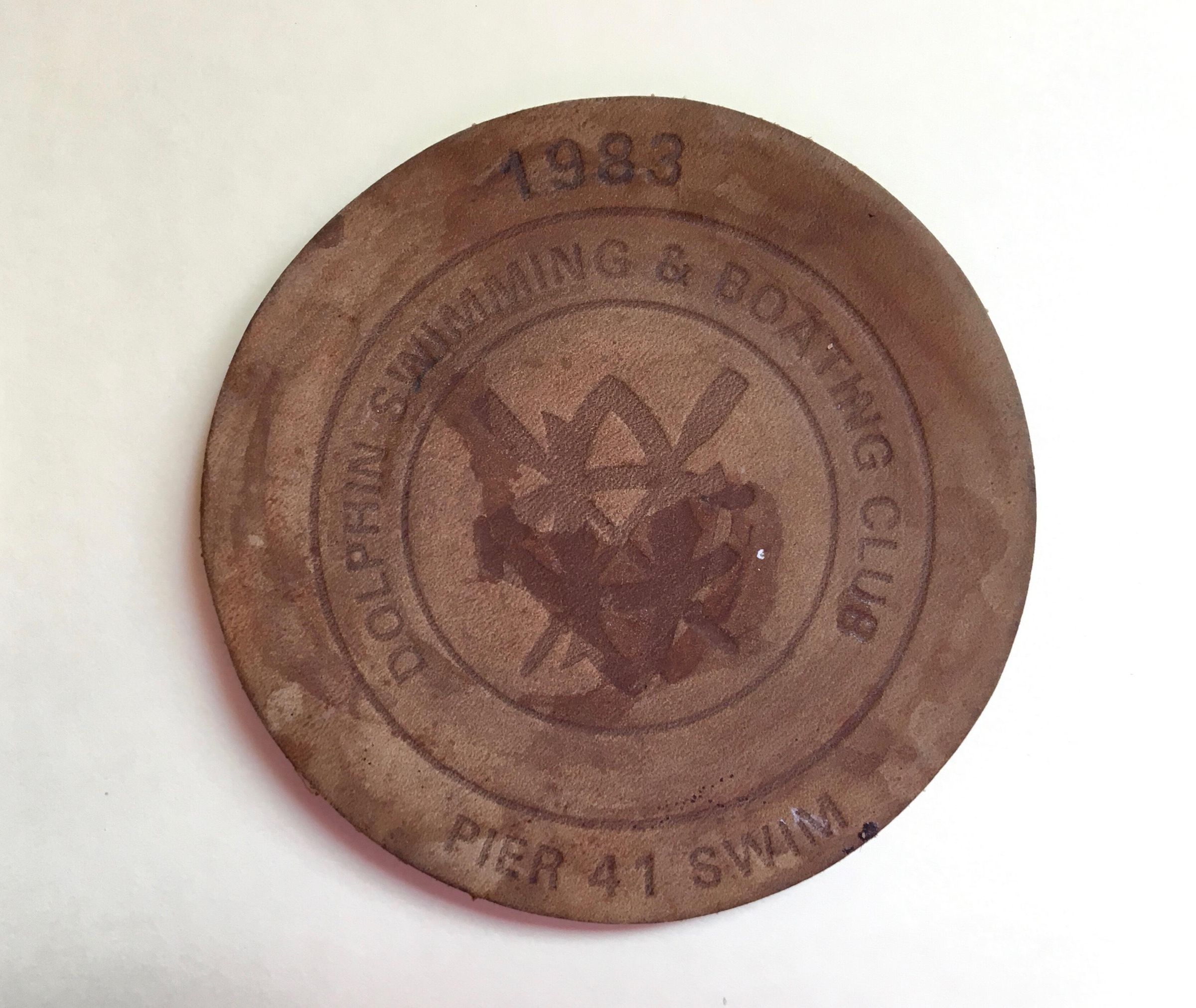 1. 1983 Pier 41: Brown leather coaster with DC/crossed oars logo in center and full name of club around that, and outside of that year on top, name of swim on bottom. Diameter 3 7/8 in.
