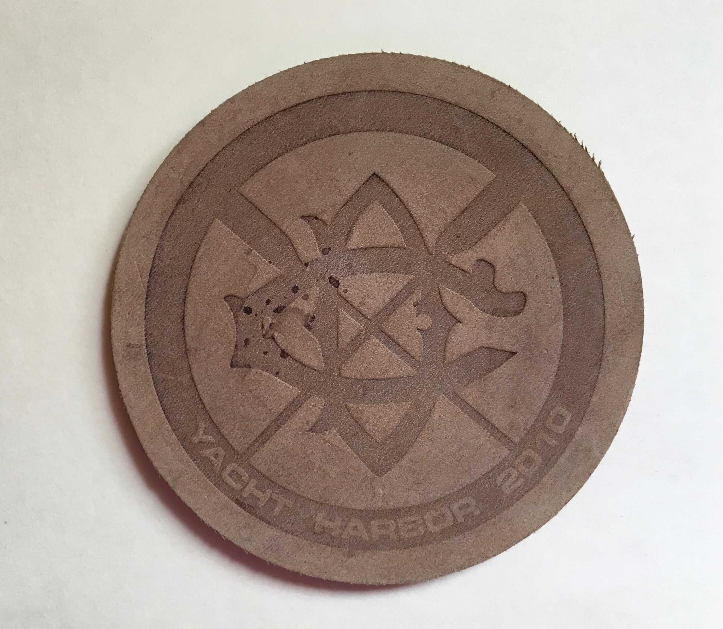 5. 2010 Yacht Harbor: Brown leather coaster with large DC/crossed oars in center with Yacht Harbor 2010 written in border on bottom. Diameter 3 5/8 in.
