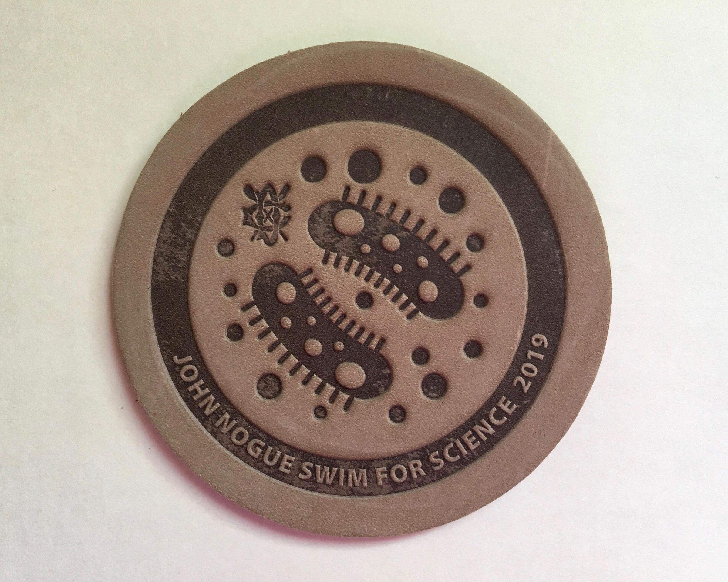 7. 2019 John Nogue Swim for Science: Brown leather coaster with two virus with flagella surrounded by 16 spots and small DC/Crossed oars logo. Printed on bottom/side of band: John Nogue Swim for Science 2019. Diameter 3 3/4 in.