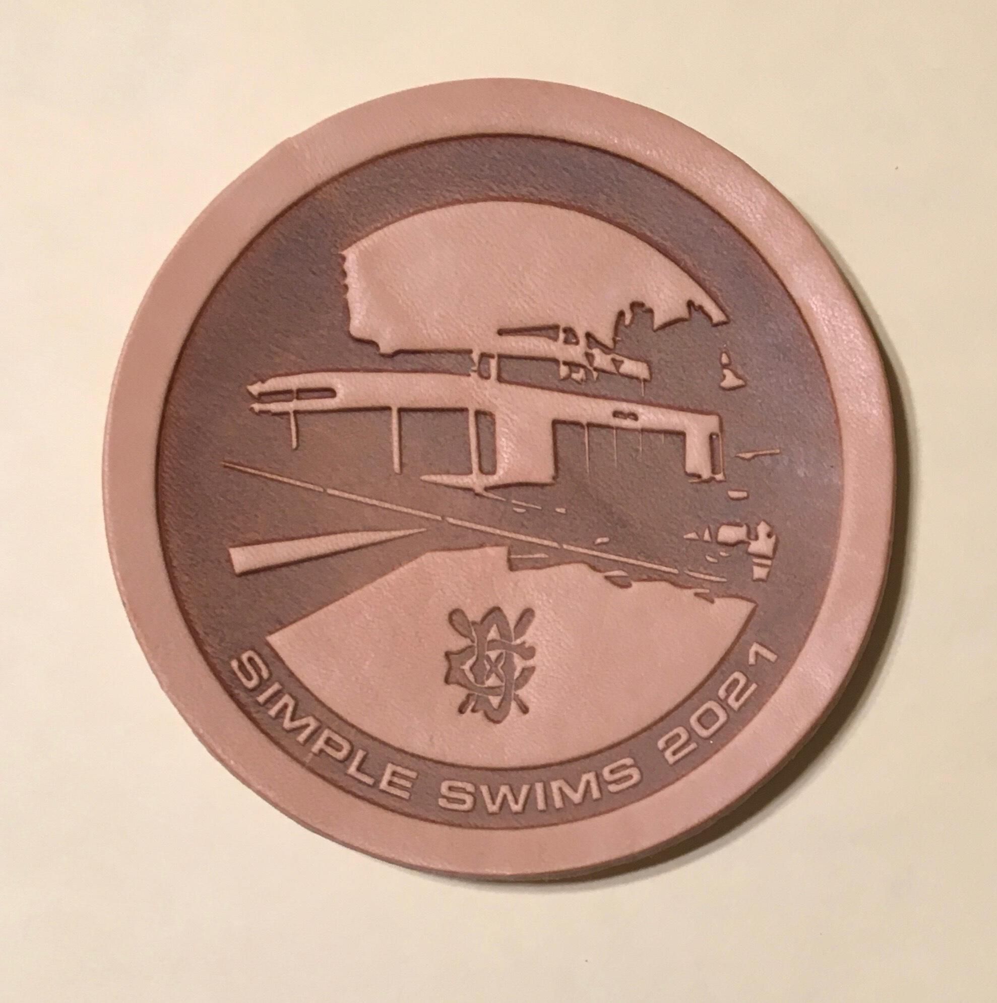8. 2021 Simple Swims: Reddish brown leather coaster with debossed image of Maritime Museum in a circular band. DC/crossed oars logo in bottom of center area. Printed on bottom in band: "Simple Swims 2021." Diameter 3 1/2 inches. Designed by Jim Frew.