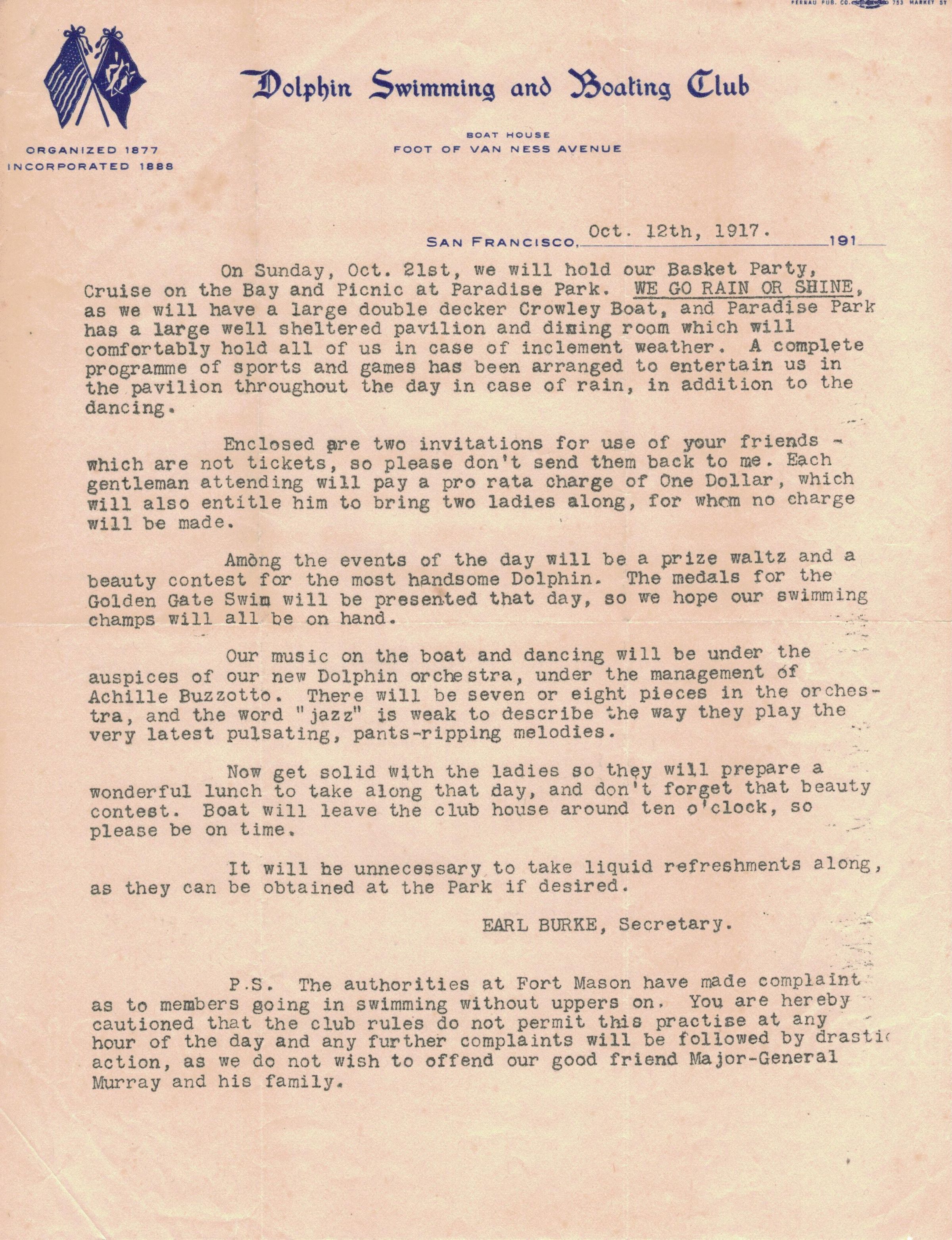 Letter dated Oct 12, 1917 from Earl Burke, Club Secretary, about upcoming Basket Party, Bay Cruise and Picnic at Paradise Cove on Oct 21, 1917.