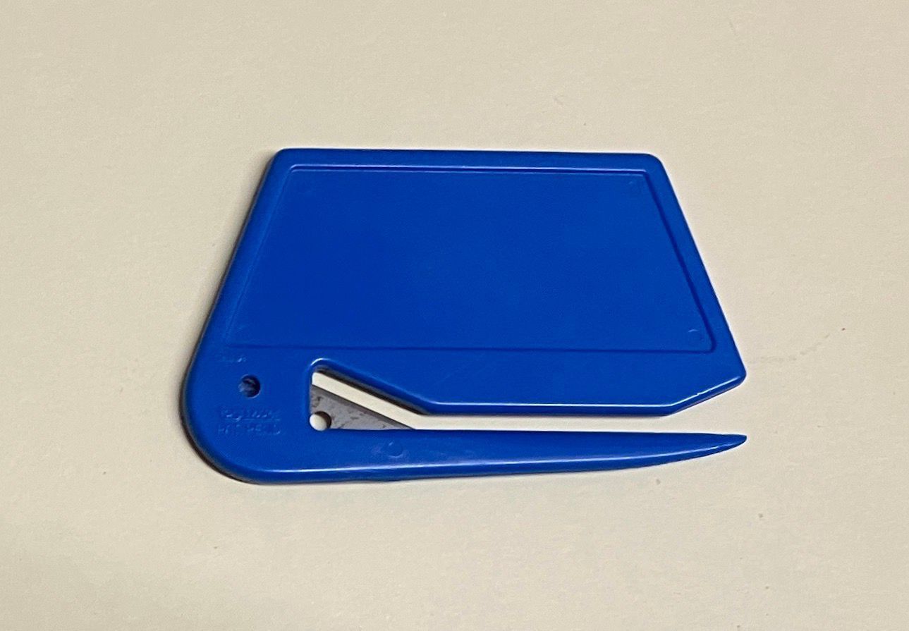 Trapezoid shaped blue plastic tool with arm and blade at bottom, silver printing.