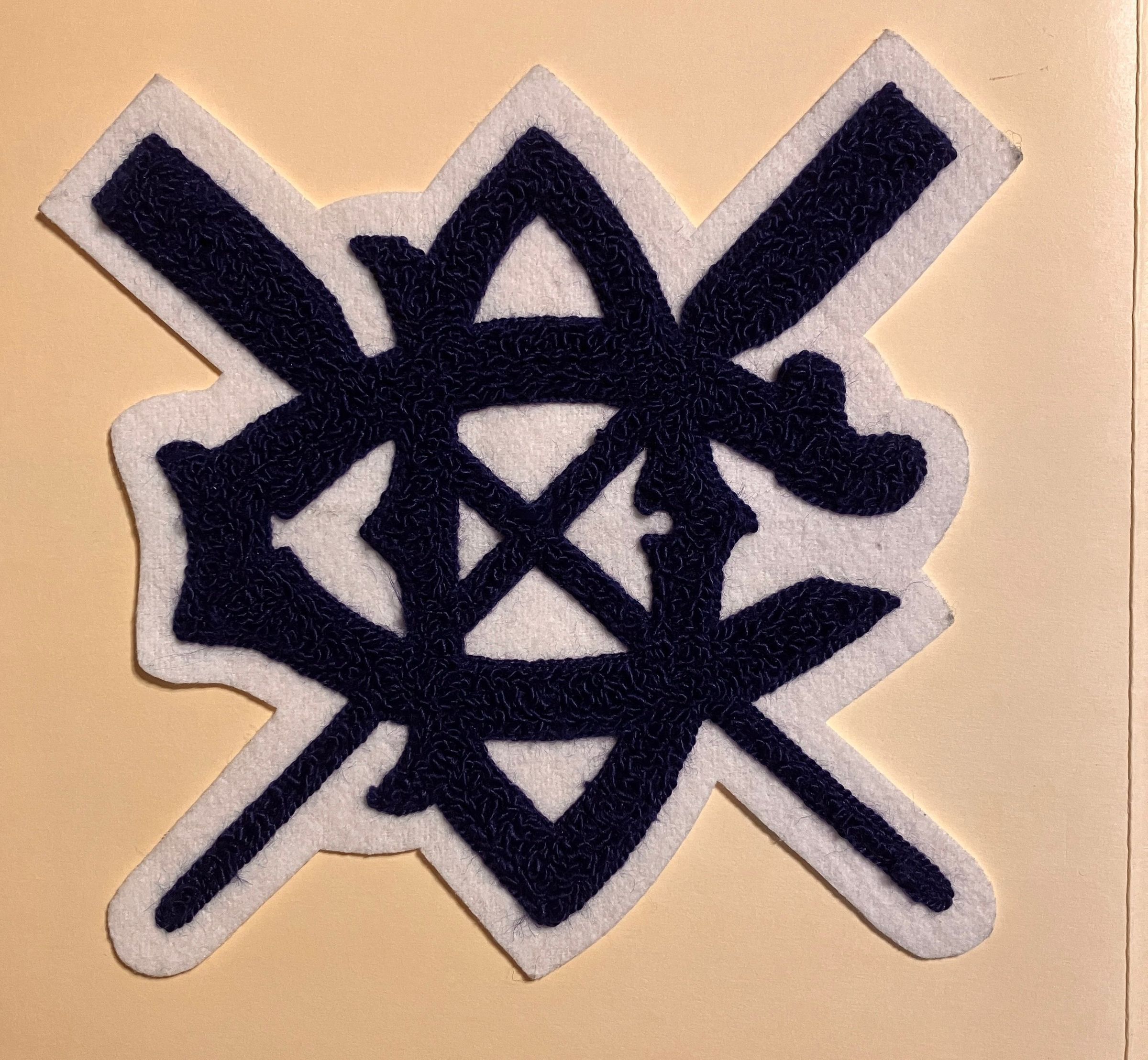Dark blue almost black Dolphin Club chenille letter patch, with crossed oars and D and C. Letter is sewn on white felt with white cloth backing. Letter was first made in the 1980s.