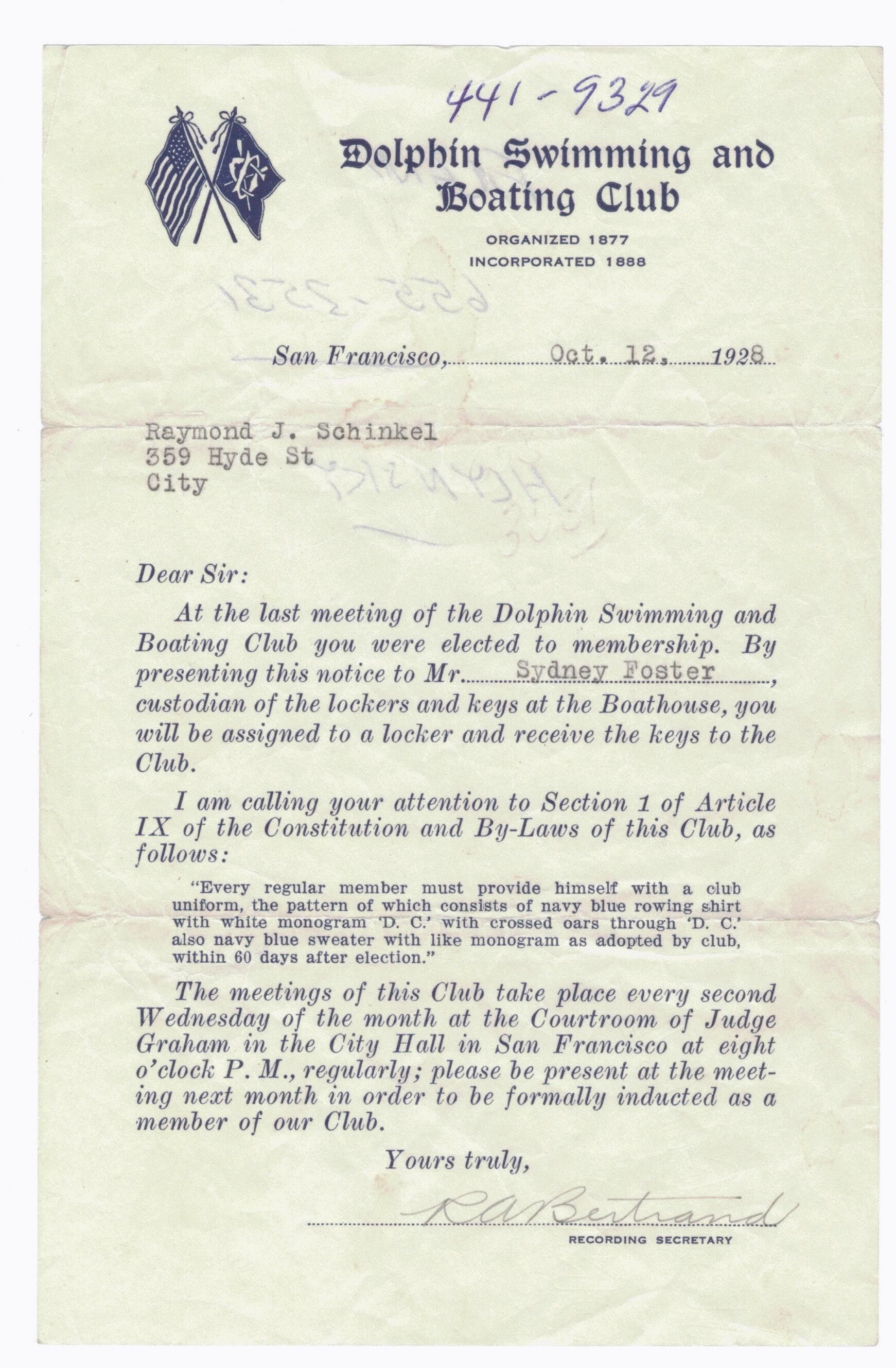 Form letter to new DC member on club letterhead, to be presented to Sydney Foster, locker custodian, for issuance of locker and keys. Includes advice to new member regarding required purchase of Dolphin uniform of rowing shirt and navy blue sweater.