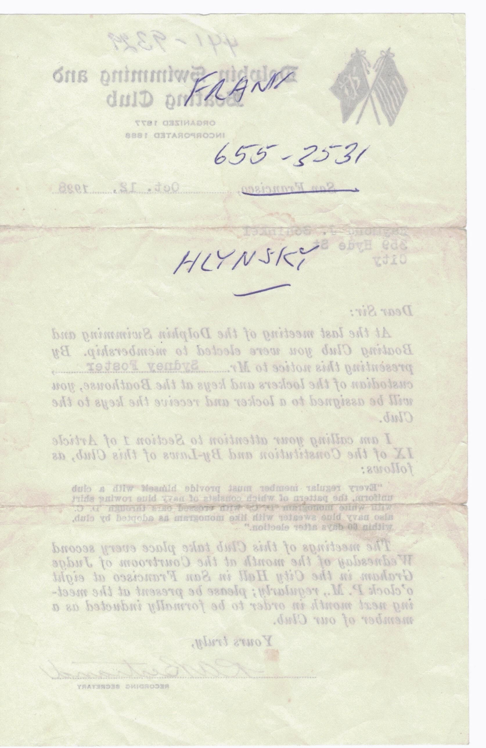 Two names and two numbers are hand written in blue ink on the front and back of the letter appear to have been jotted down maybe in the 1970s; two names are Frank (Drum?) and (Stan?) Hylnsky, two numbers are 441-9329 and 655-3531.Archive Details