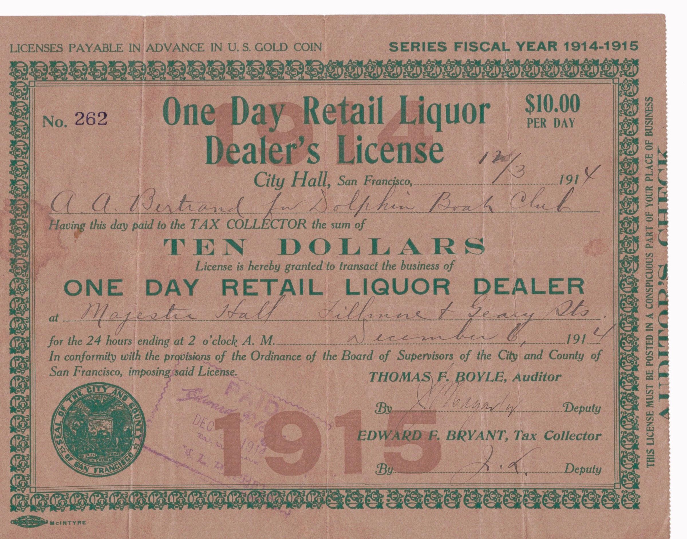 License to sell liquor at Majestic Hall DC event. For use December 5-6, 24 hours. Granted, paid ($10) and signed at SF City Hall, December 3, 1914.Archive Details