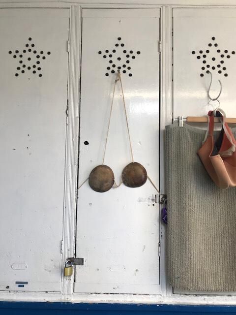 Decoration on front of wooden locker consisting of two half cocoanut shells and string, suggesting a brassiere. Decoration remains on locker even though occupant changes.Made/Created