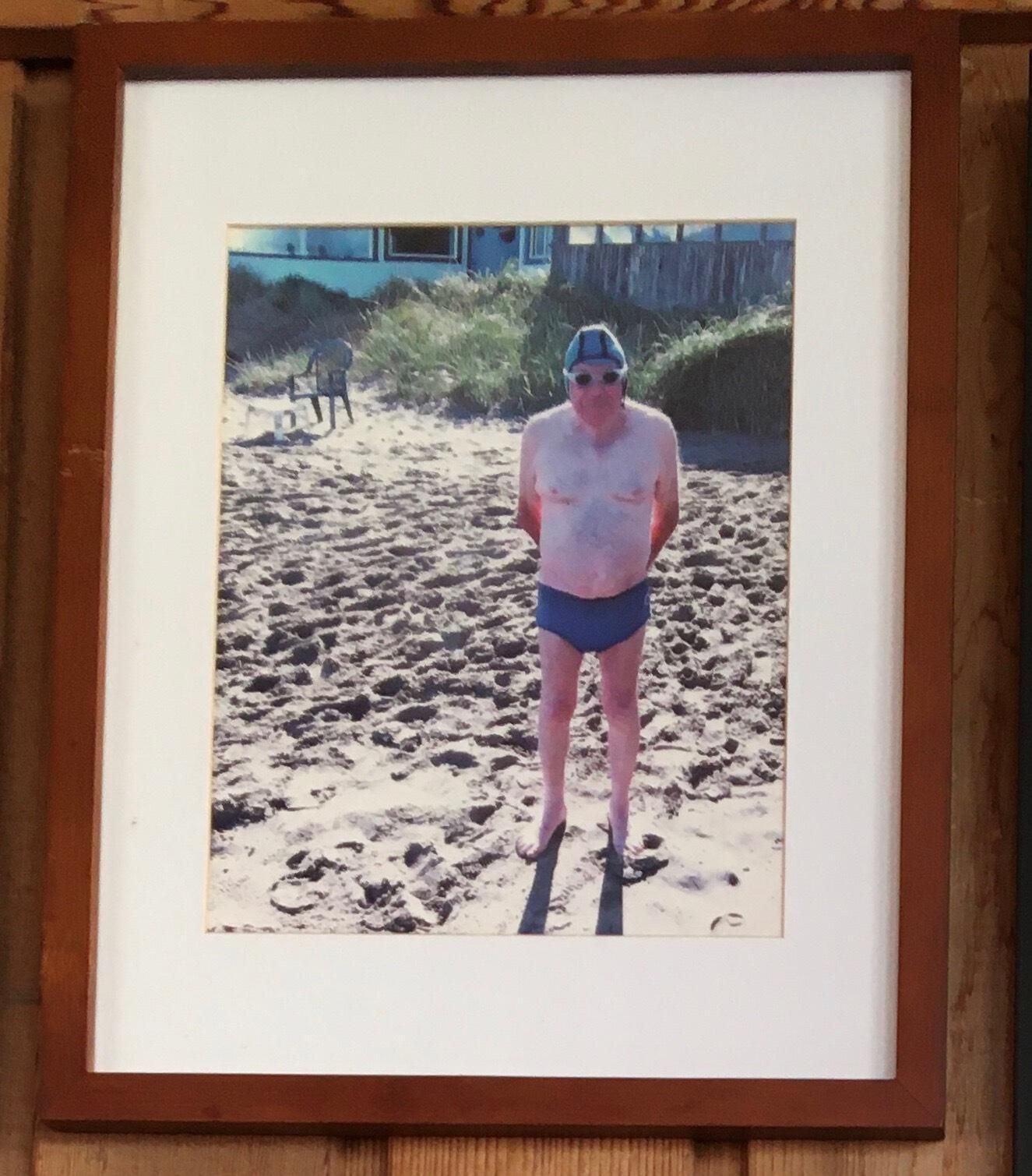 Color photo of Lou Marcelli on the beach taken by Bill Burke on September 26, 2010. Brown wood frame, white mat.