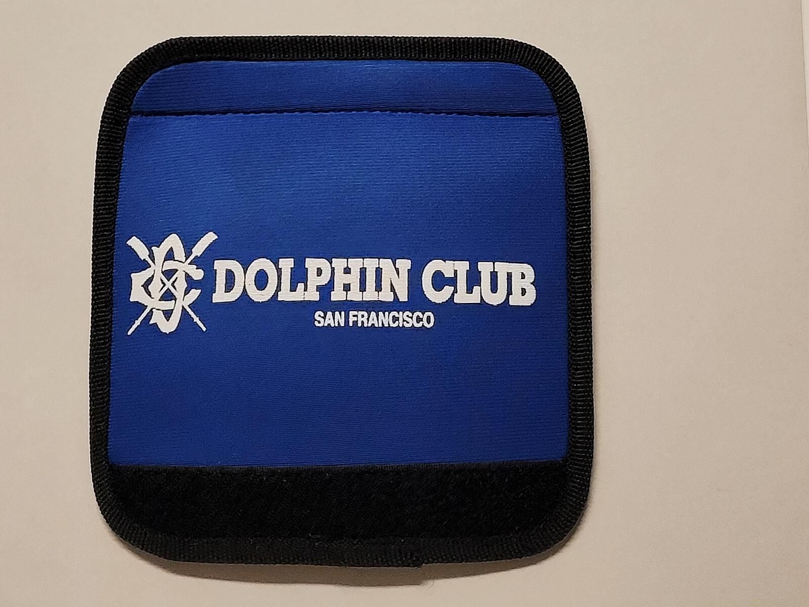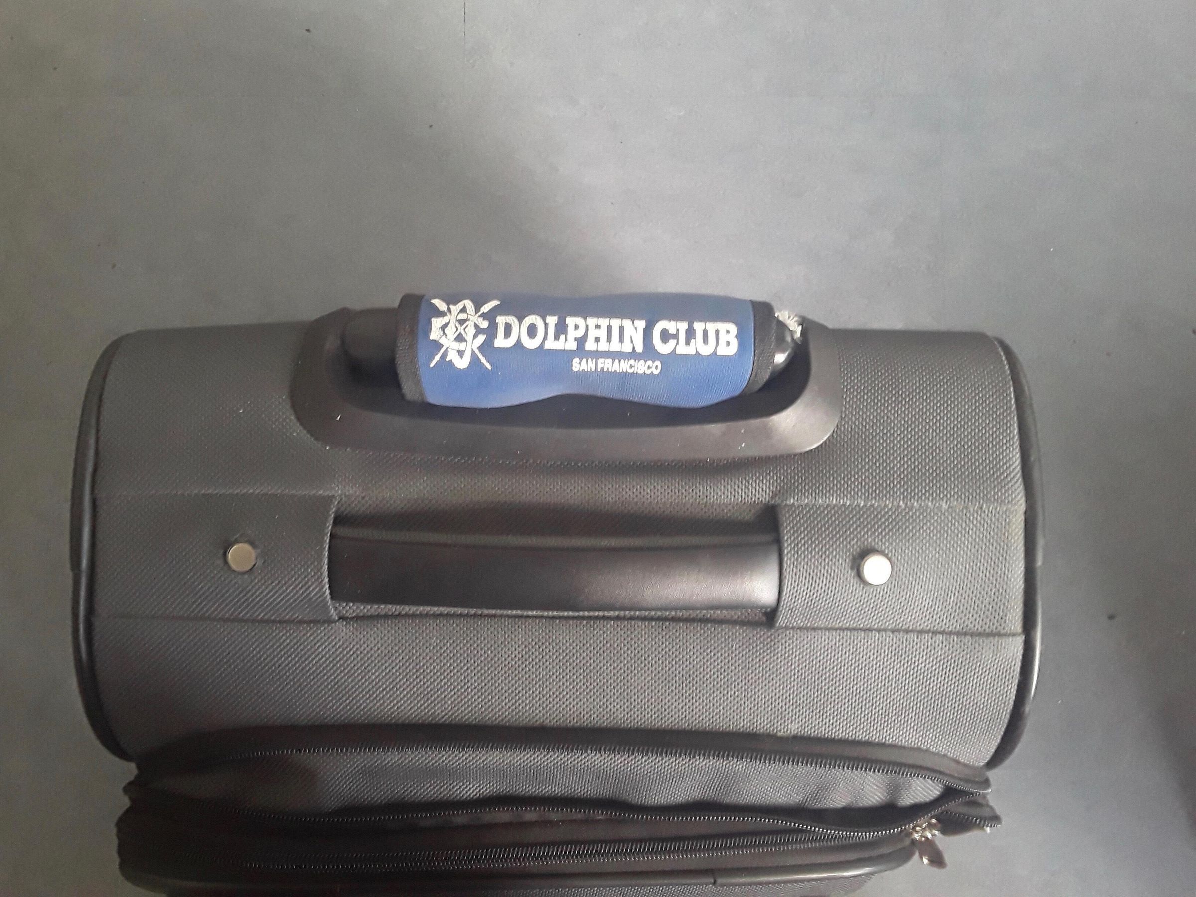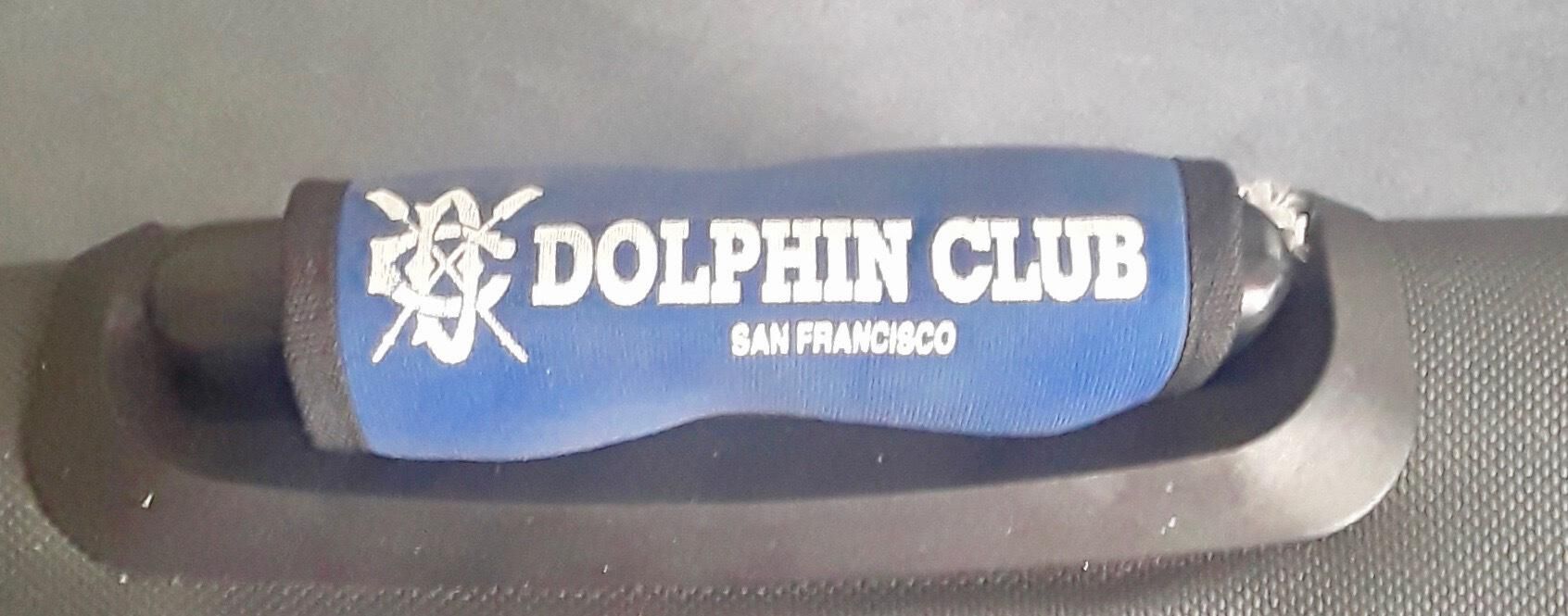 Padded grip for luggage handle with Velcro. Blue with white text: "Logo, Dolphin Club, San Francisco"
