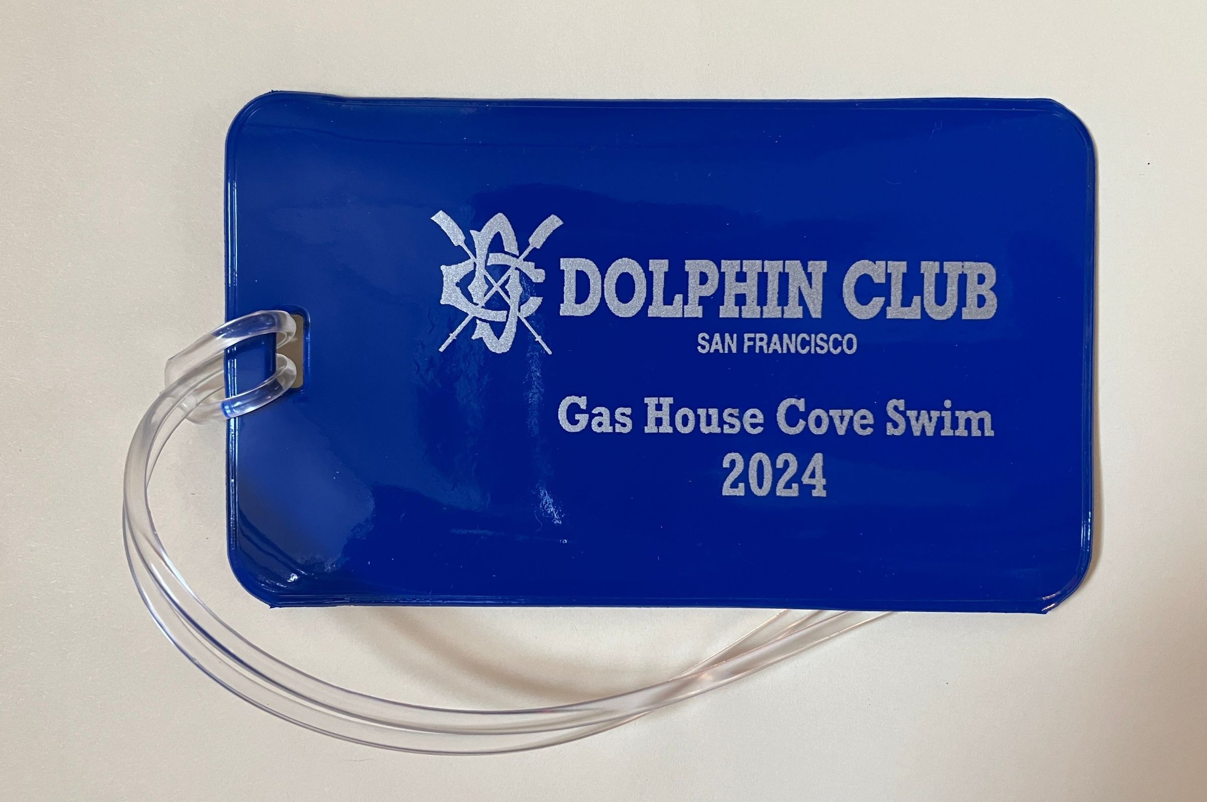 Text in white on blue side: Crossed oars logo - Dolphin Club - San Francisco - Gas House Cove Swim - 2024