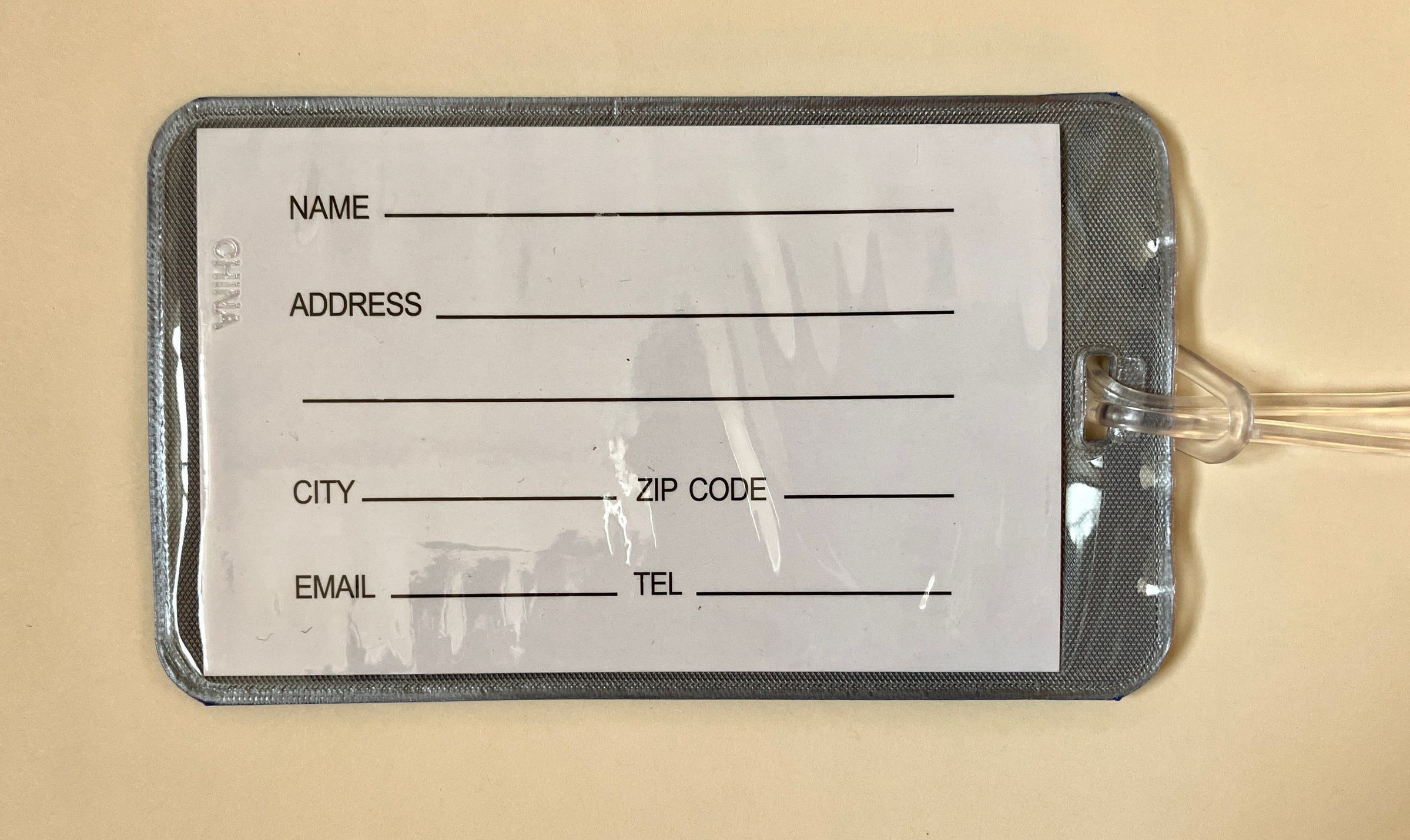 Blue plastic luggage tag with plastic cord to attach to suitcase. Clear plastic on other side contains a card to write contact information.