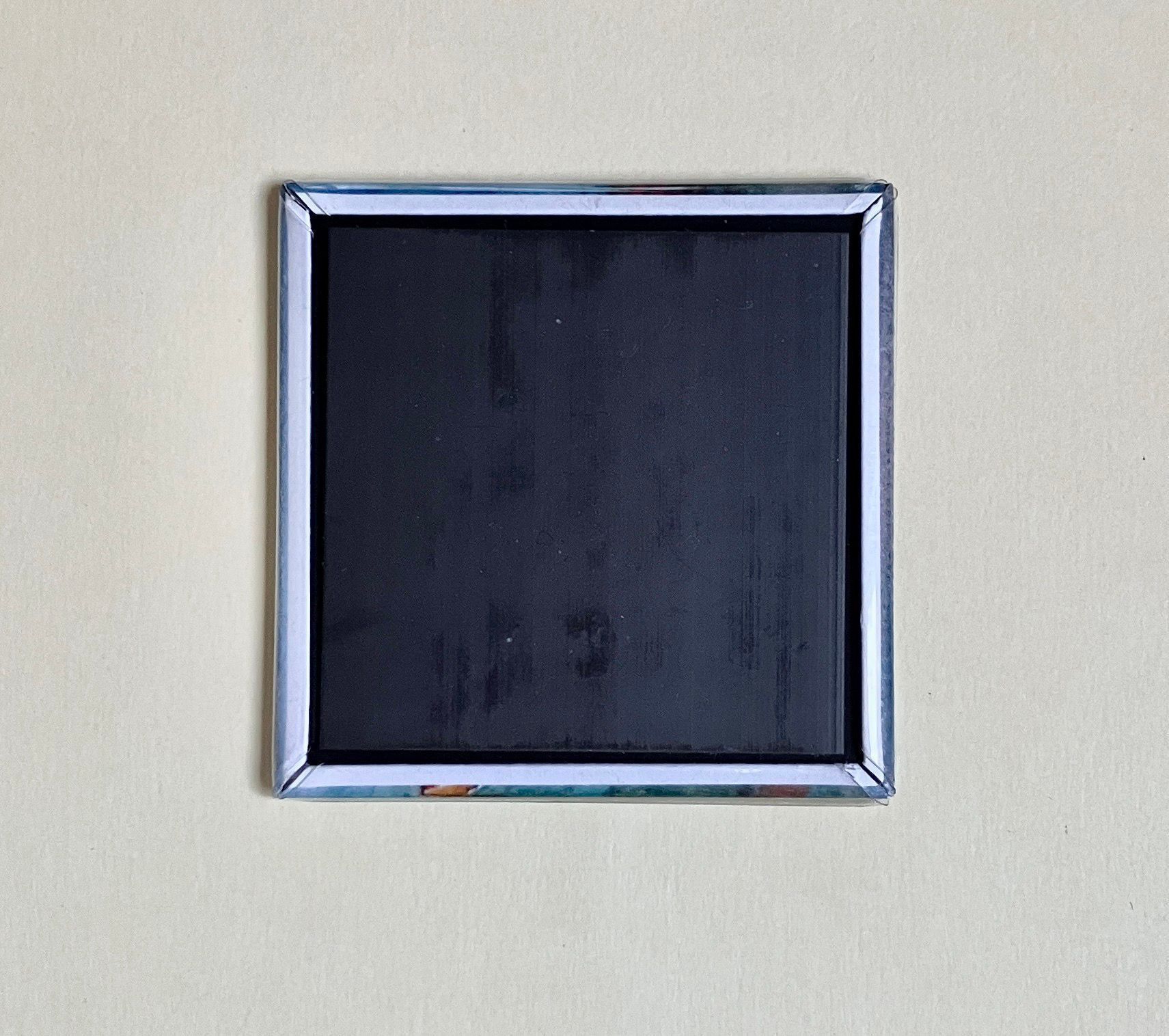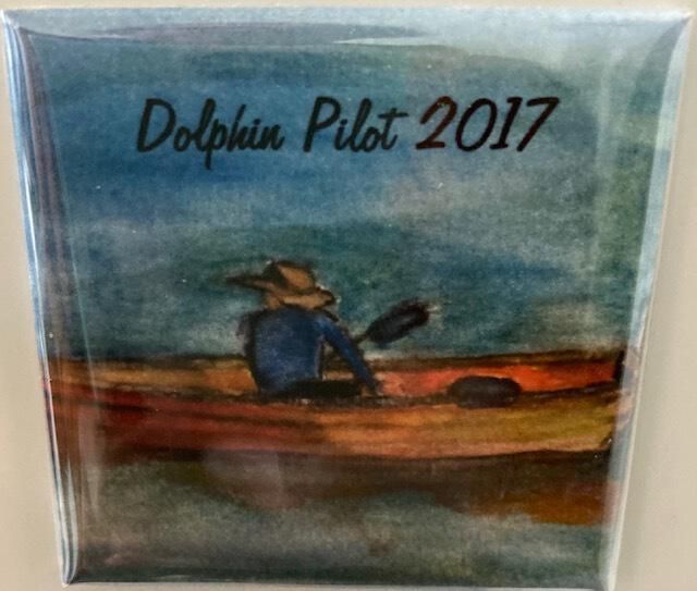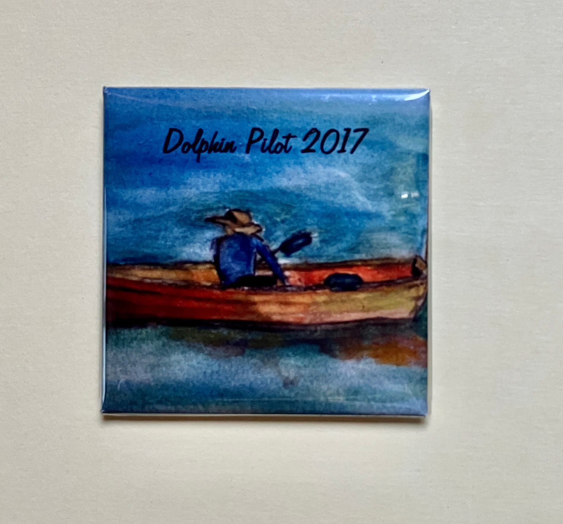 Square magnet with color drawing of a wooden boat and a rower in tan hat, blue water background Caption on top: Dolphin Pilot 2017 Artwork by Aniko Kurczinak.