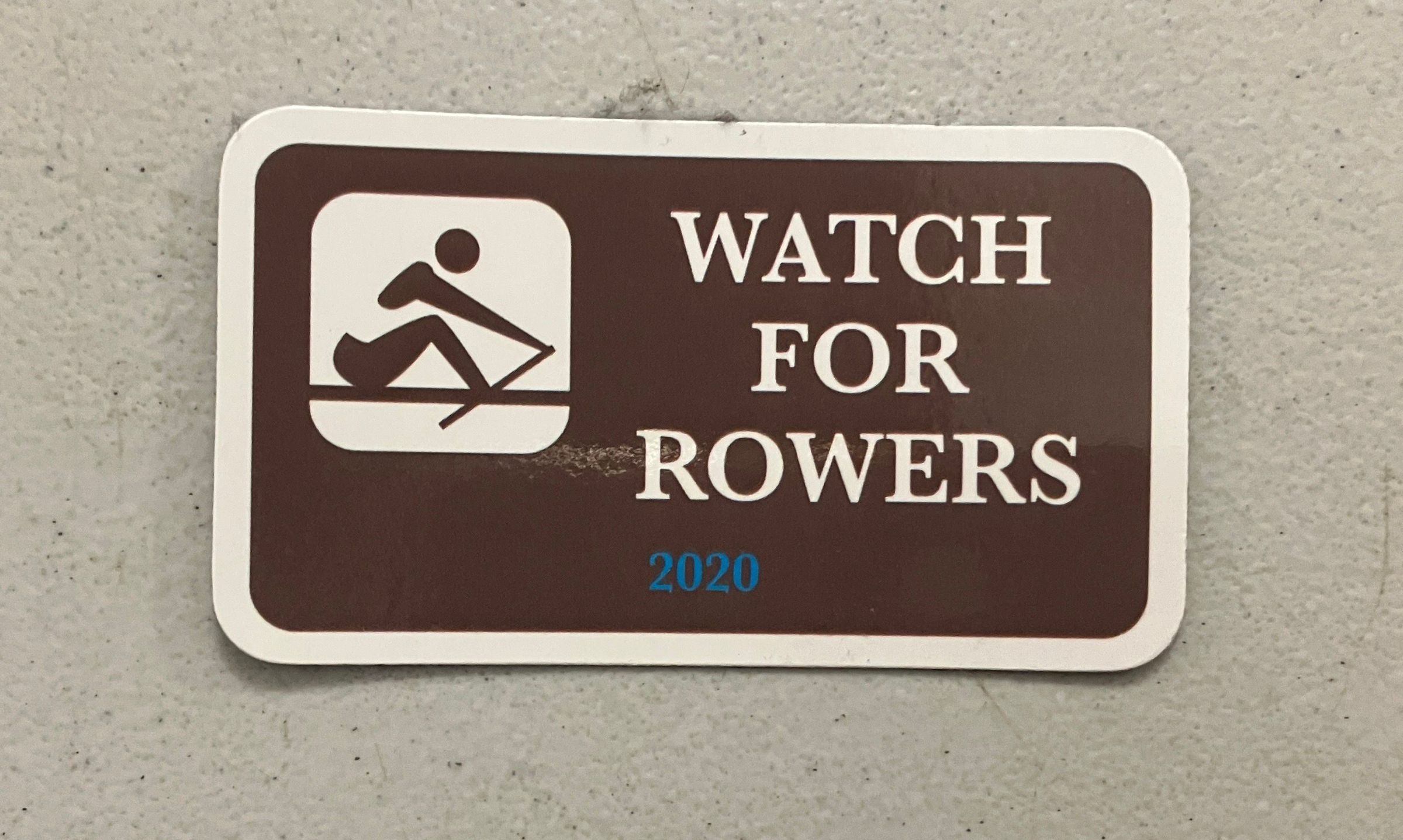Rectangular magnet, brown with white printed text and logo of a rower. Text in white: "Watch - For - Rowers" Text in blue: "2020"