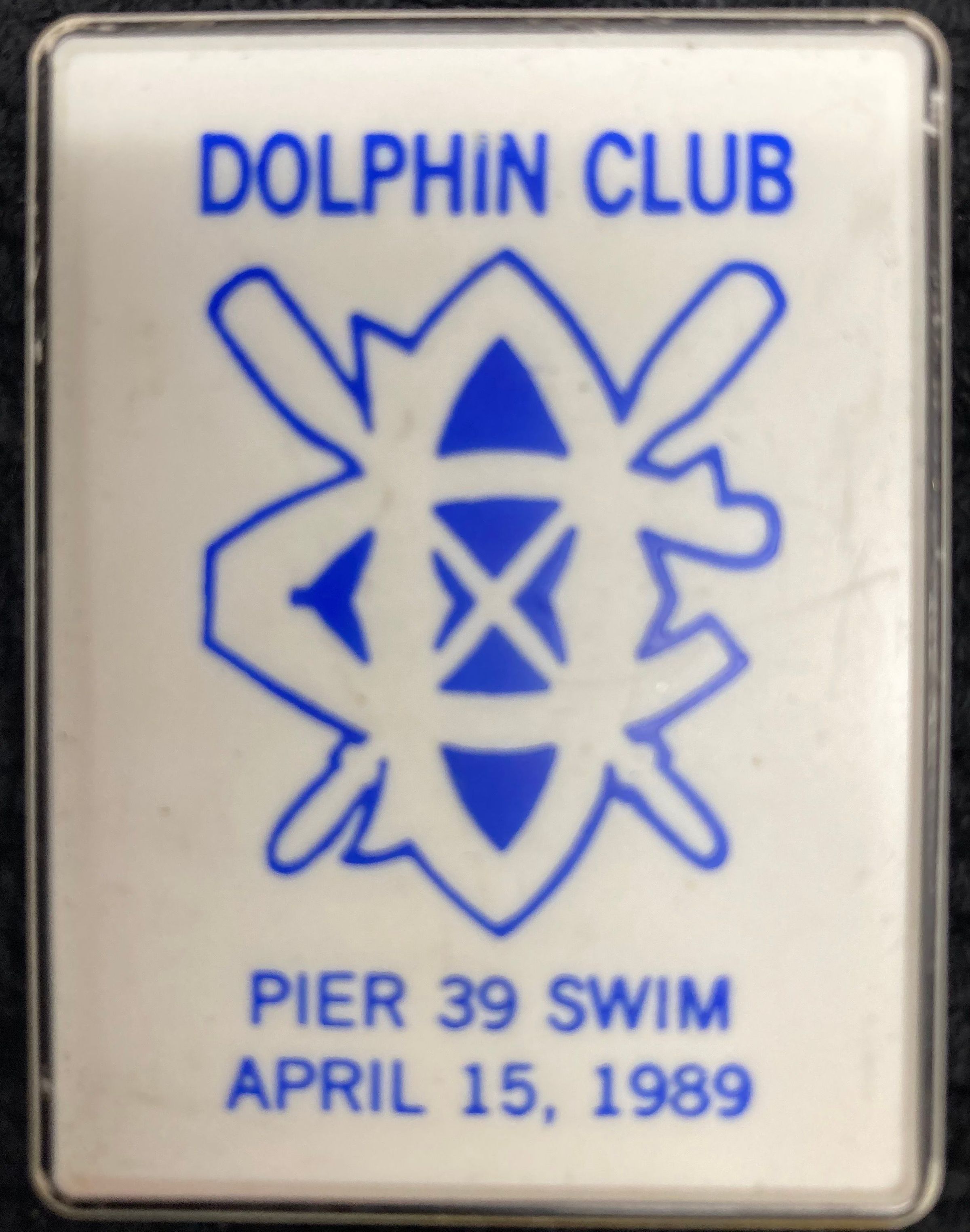 Text: "Dolphin Club - outline of crossed oars logo - Pier 39 Swim -April 15, 1989."Use