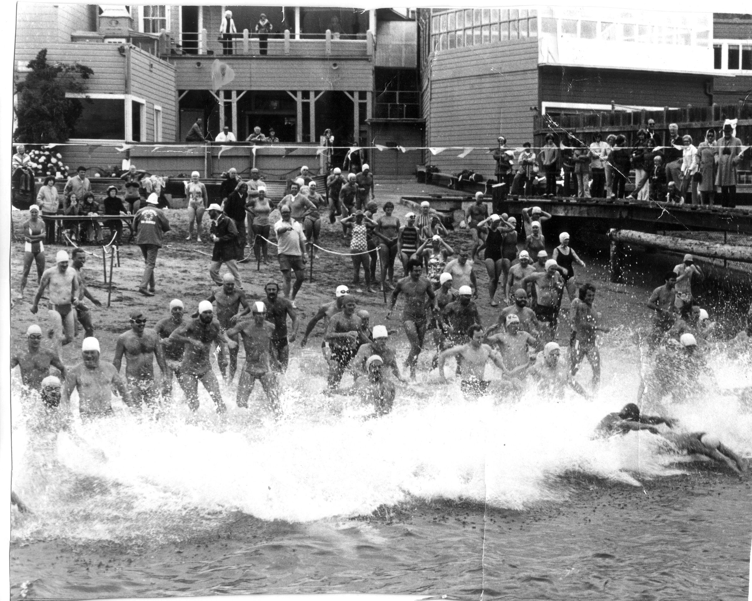 Many swimmers starting an Aquatic Park cove swim