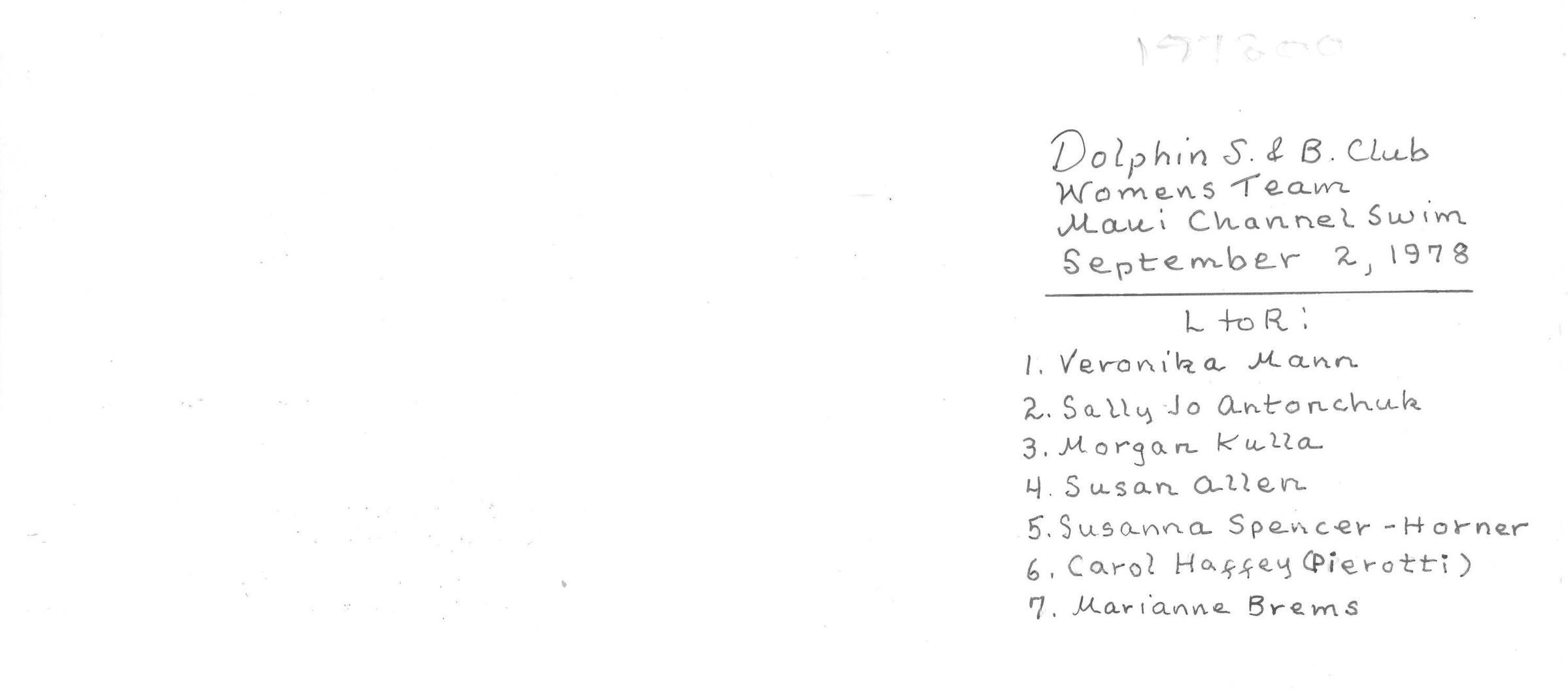 Women's Relay Team: Veronika Mann, Sally Jo Antonchuk, Morgan Kulla, Susan Allen, Susanna Spencer-Horner, Carol Haffey (Pierotti), and Marianne BremsSubject Person or Organization