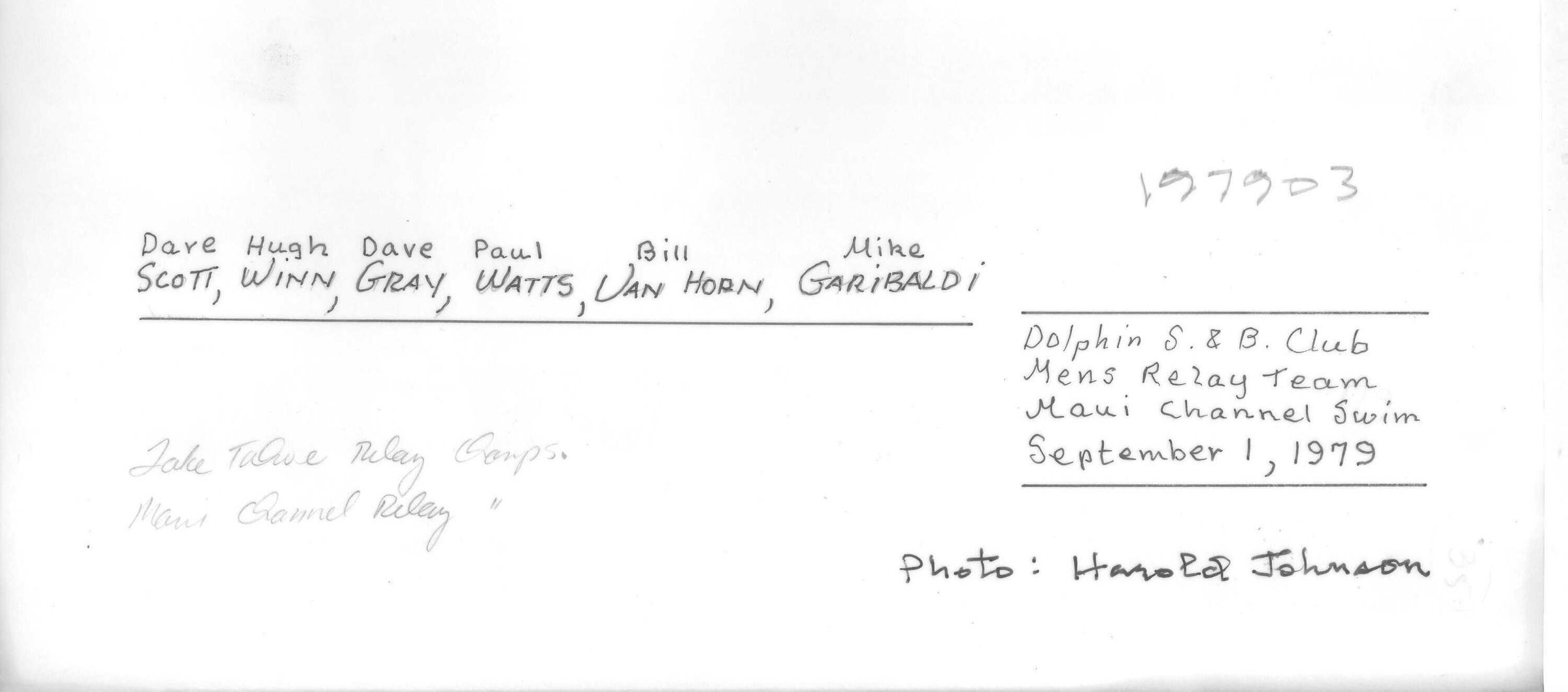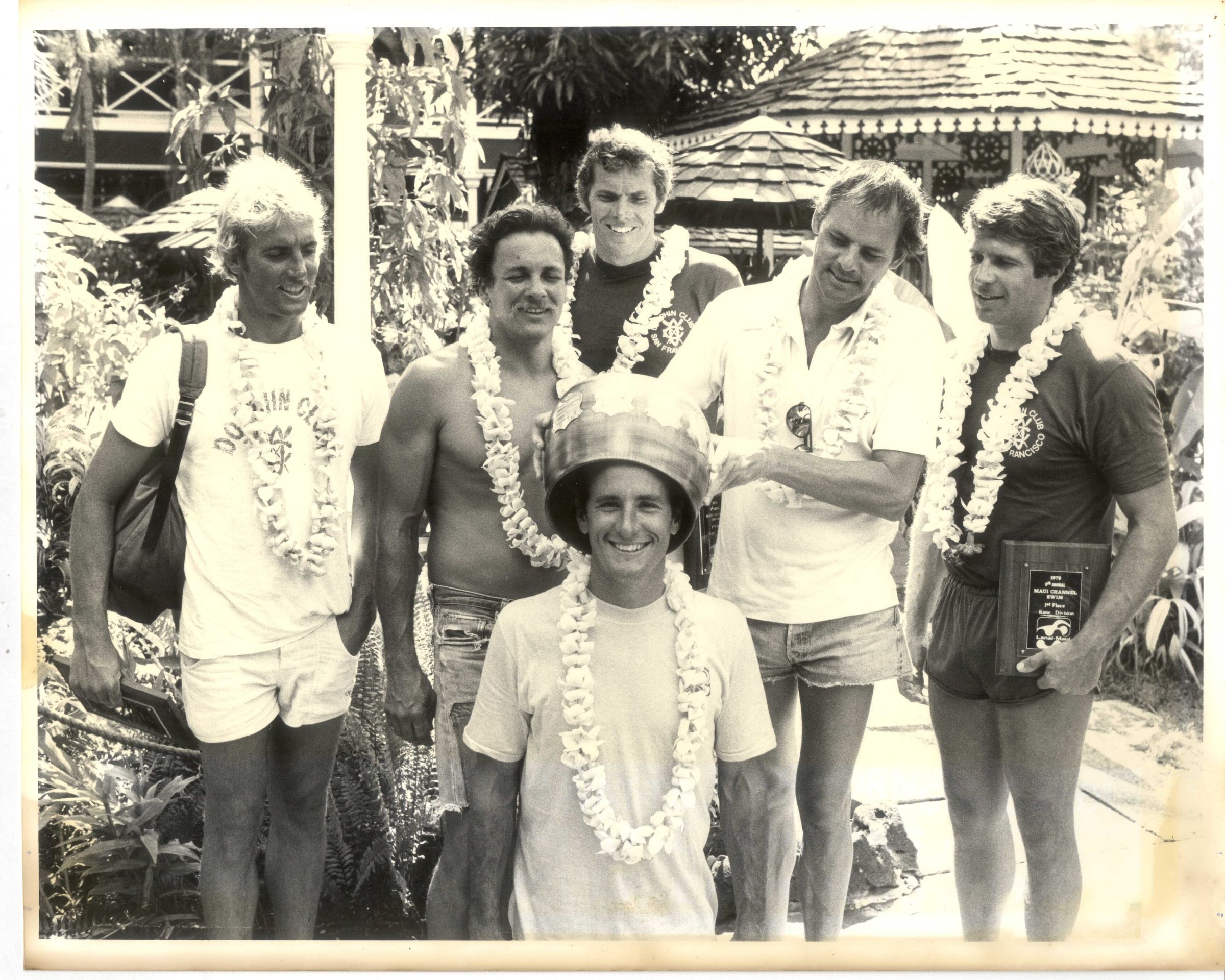 The Dolphin Club Men's Maui Channel Winners 1979: Dave Scott, Hugh Winn, Dave Gray, Paul Watts (below), Bill Van Horn, Mike Garibaldi