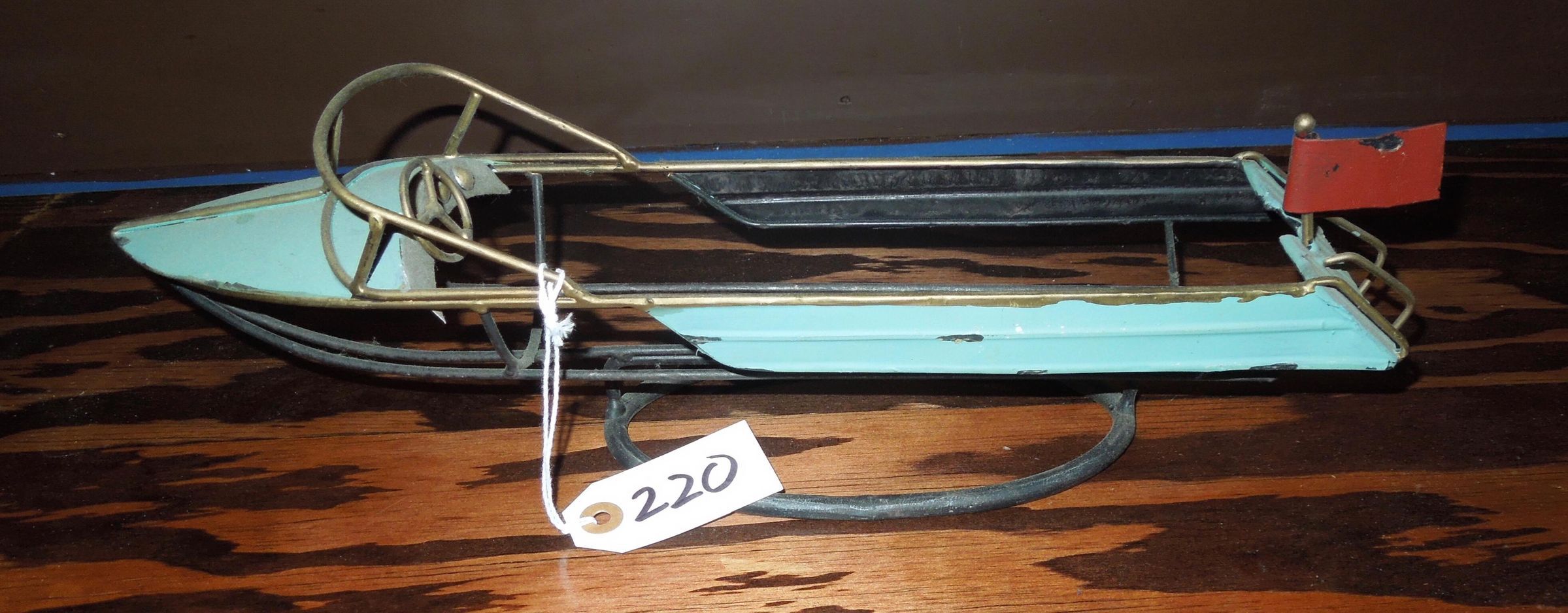 Painted metal turquoise boat model, on metal wire stand.Made/Created