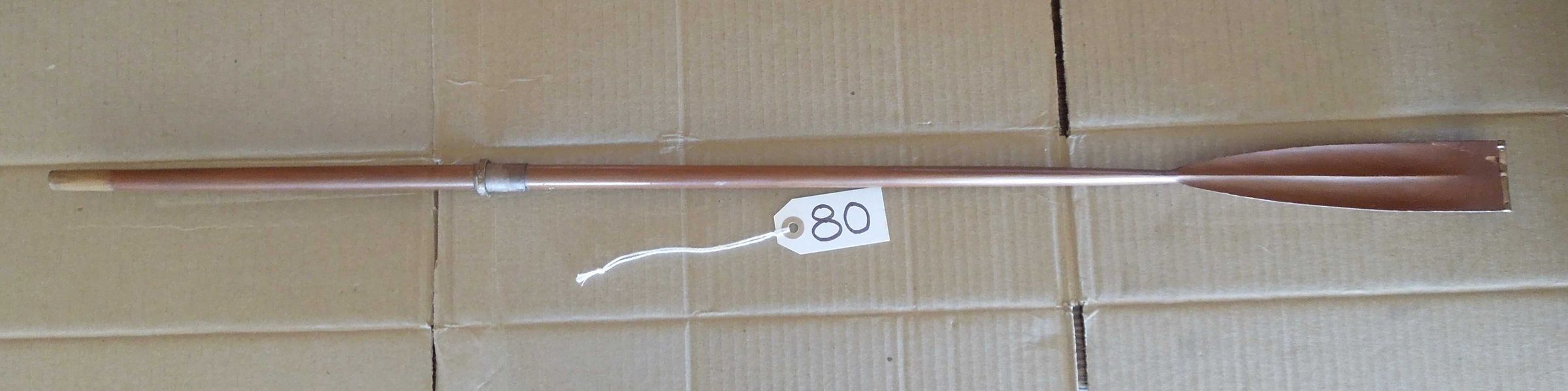 Miniature oar. Wood shaft with copper at blade tip, and copper and leather at oarlock cuff.Made/Created