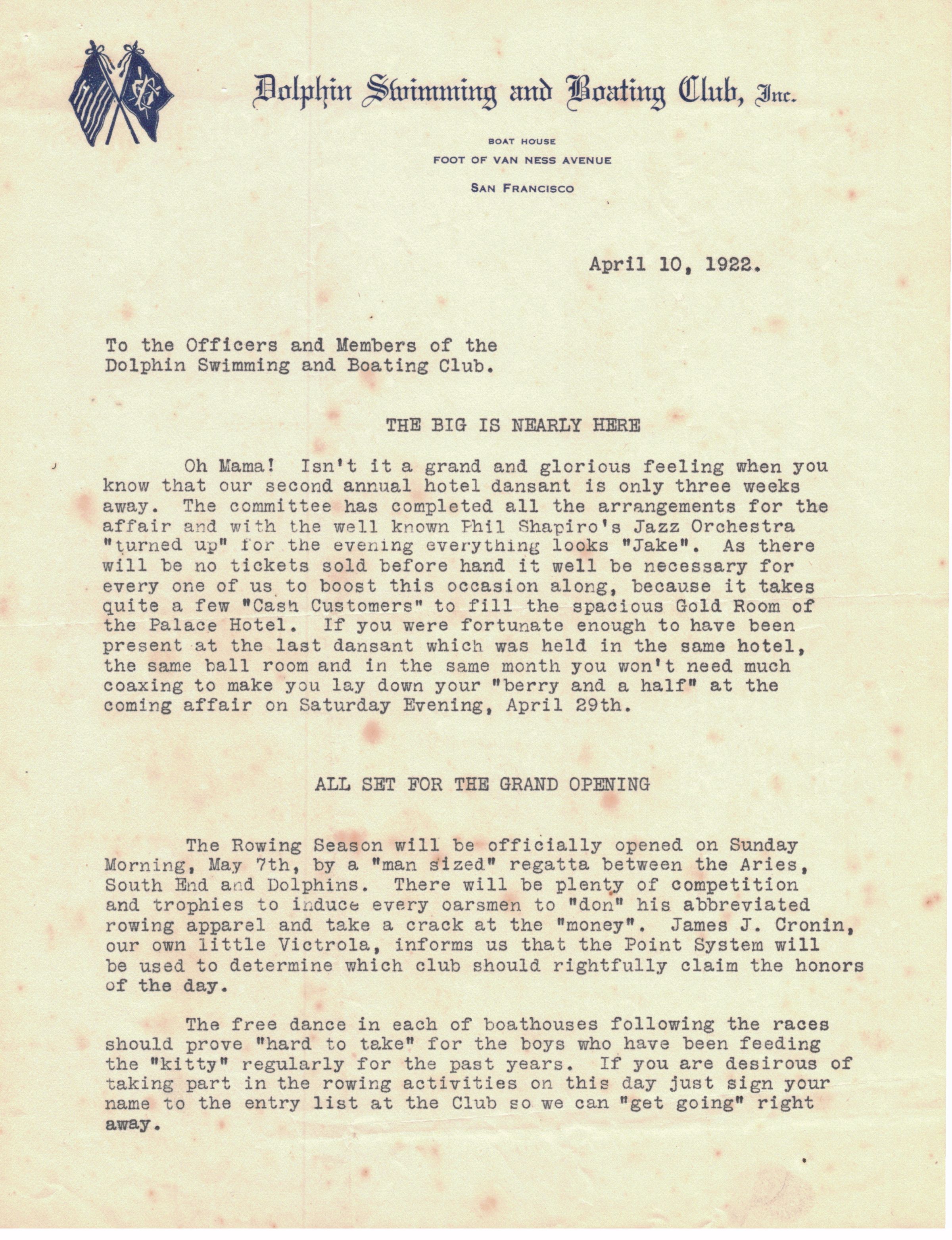Monthly letter to members and officers from Recording Secretary Lawton Hughes. Announcement of annual 'hotel dansant' at the Palace Hotel, opening of rowing season.