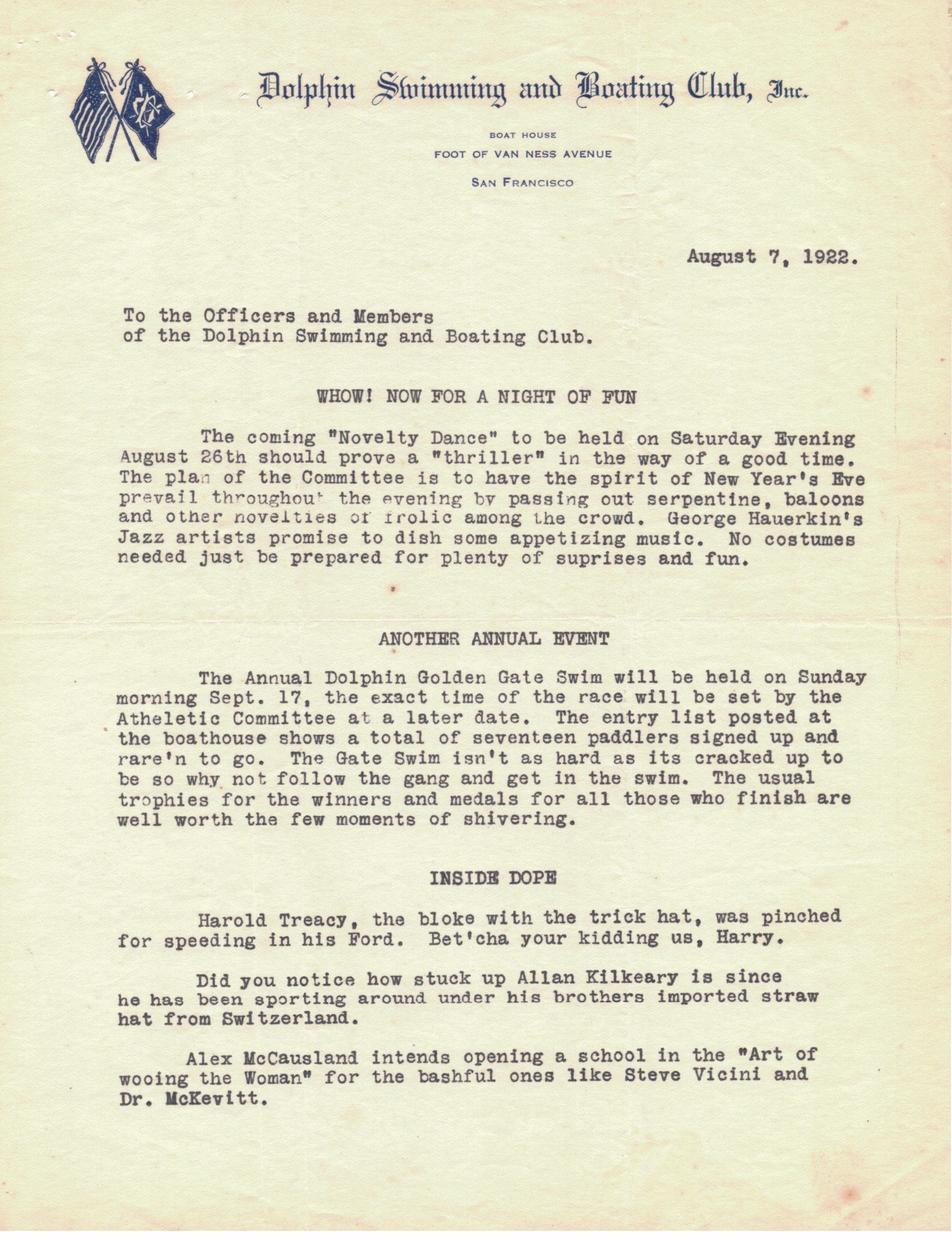 Announcement of August 25 dance and Golden Gate swim September 7.