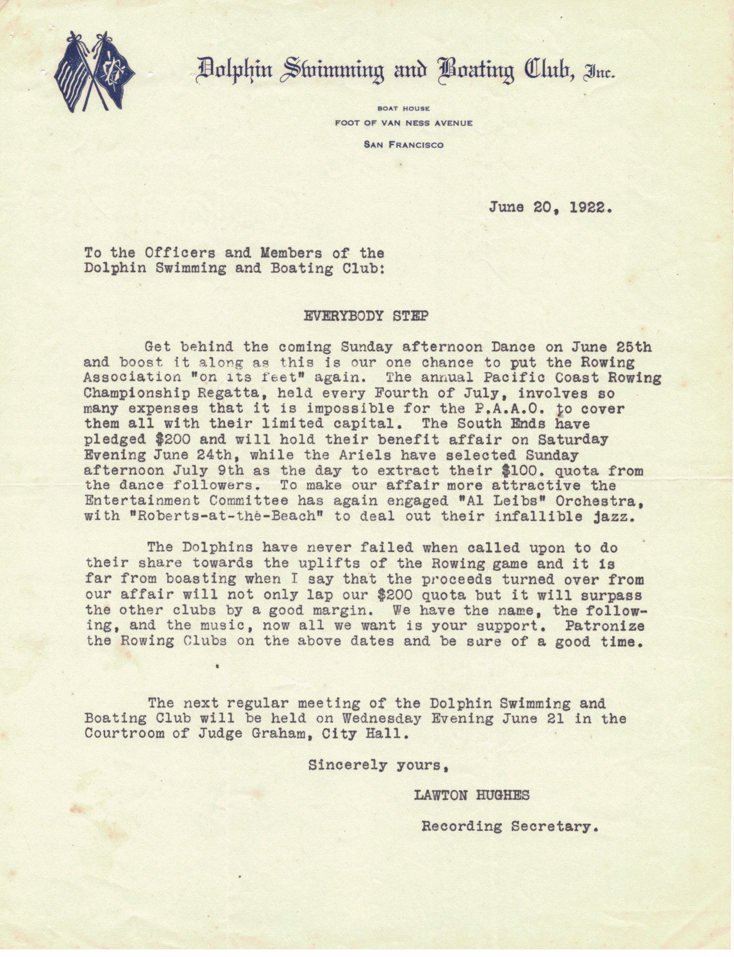 Announcement of June 25th dance party with music to raise money and help PAAO cover the cost of Pacific Coast Rowing Championship Regatta.Archive Details