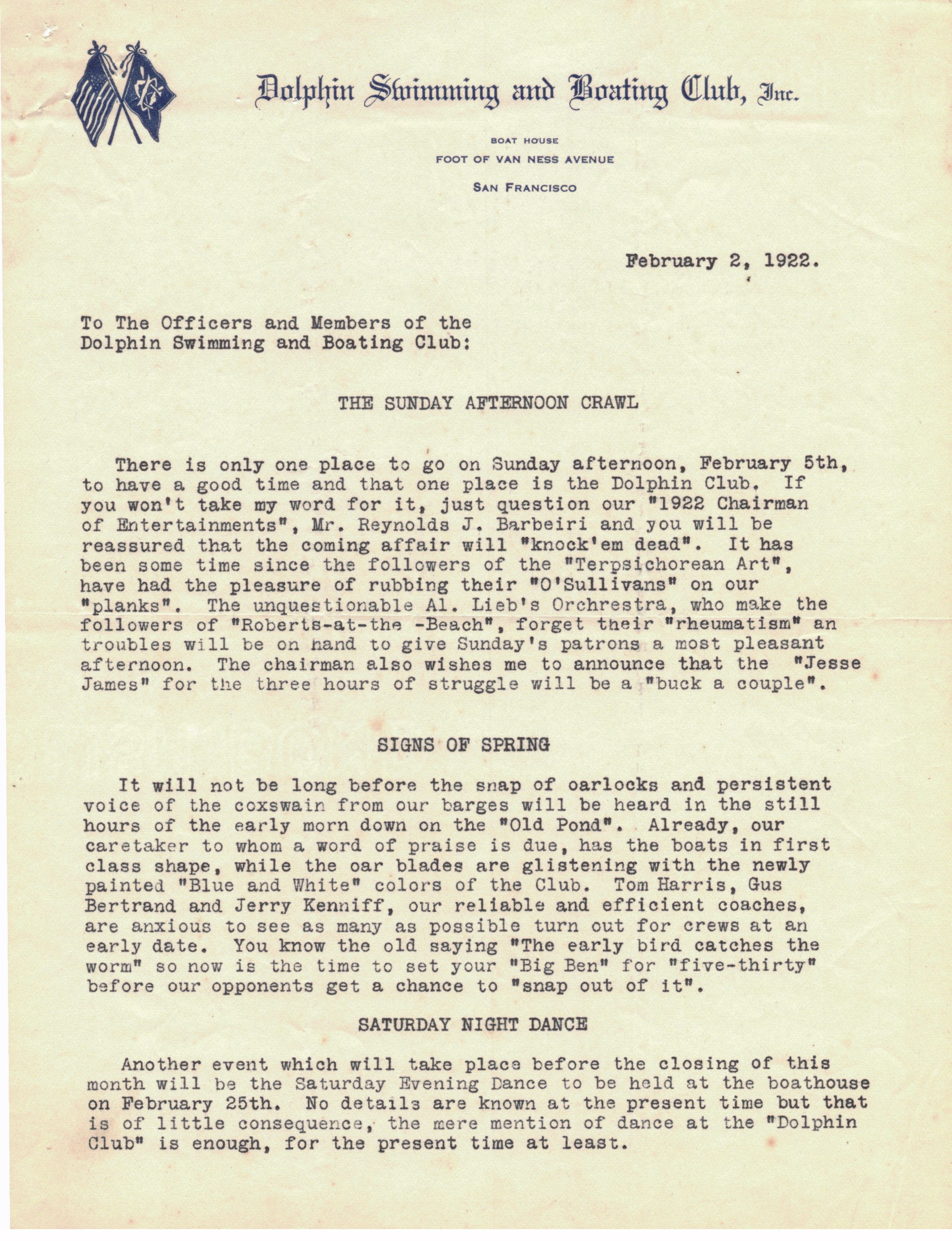 Monthly newsletter to DC officers and members from Recording Secretary Lawton Hughe . Announcements of social events- 3 dance parties, and a baseball game of teams of married and single men. List of DC committee chairs for the year.