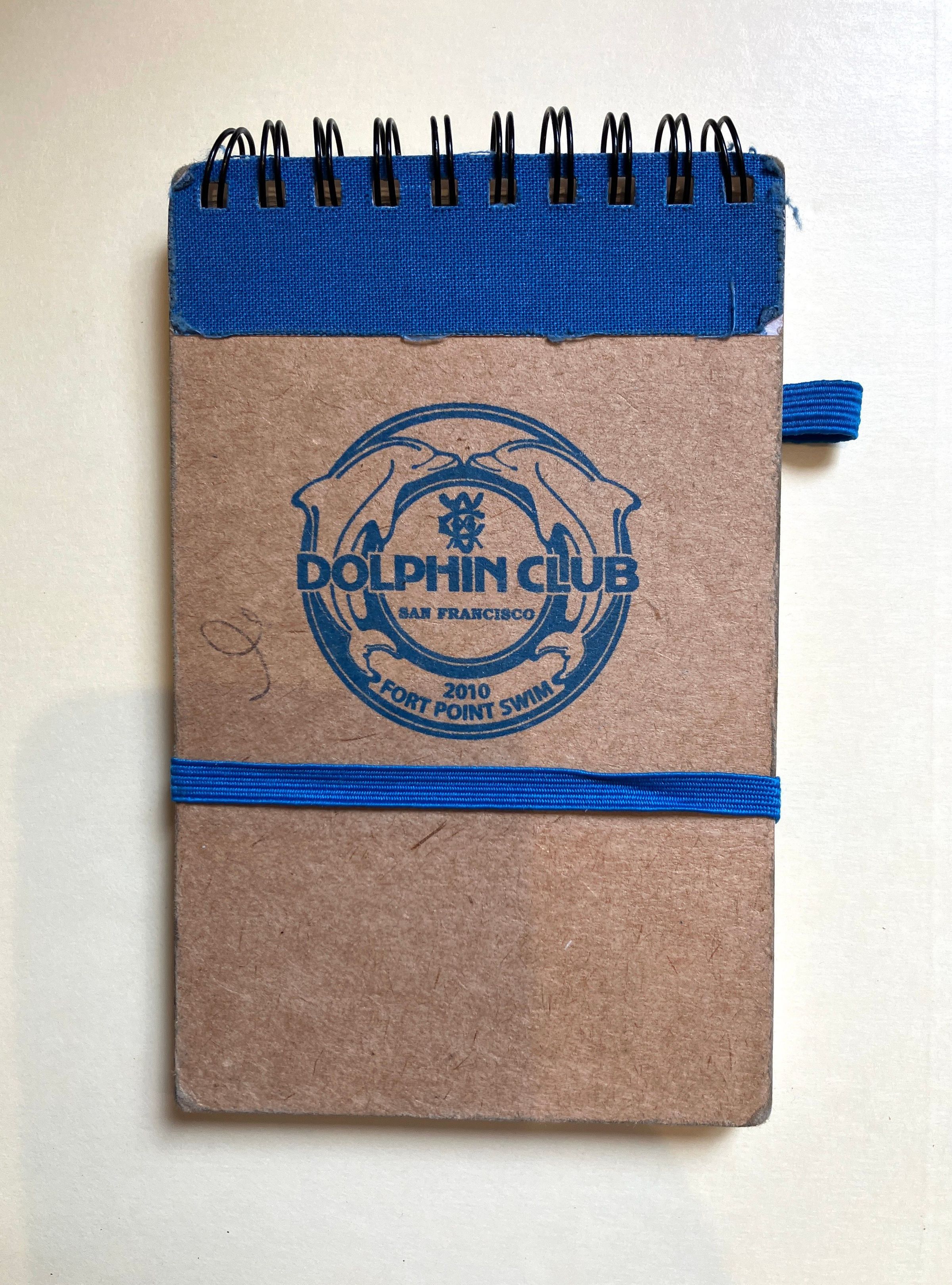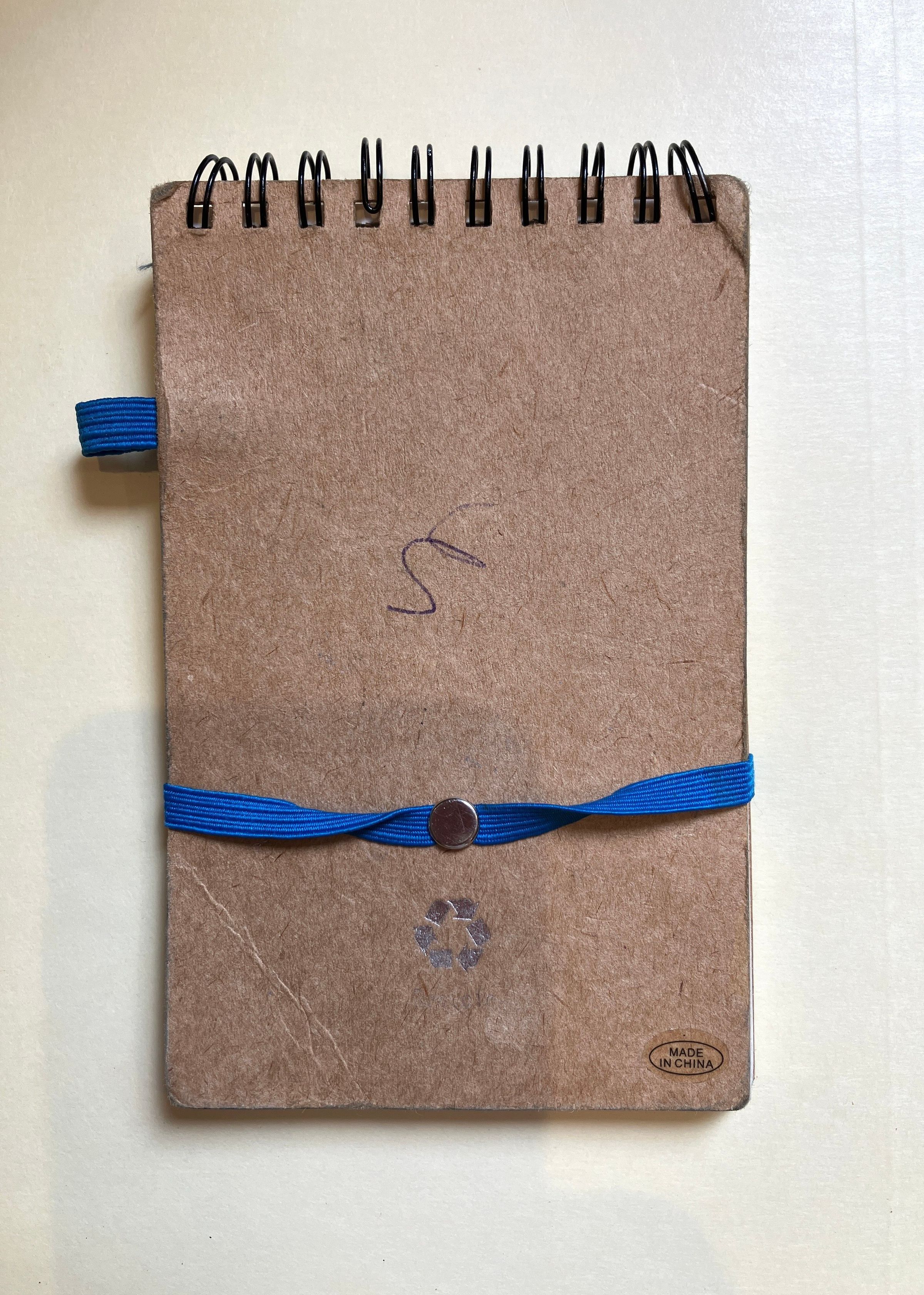 Brown notebook with blue border on top. Black wire spiral binding on top.