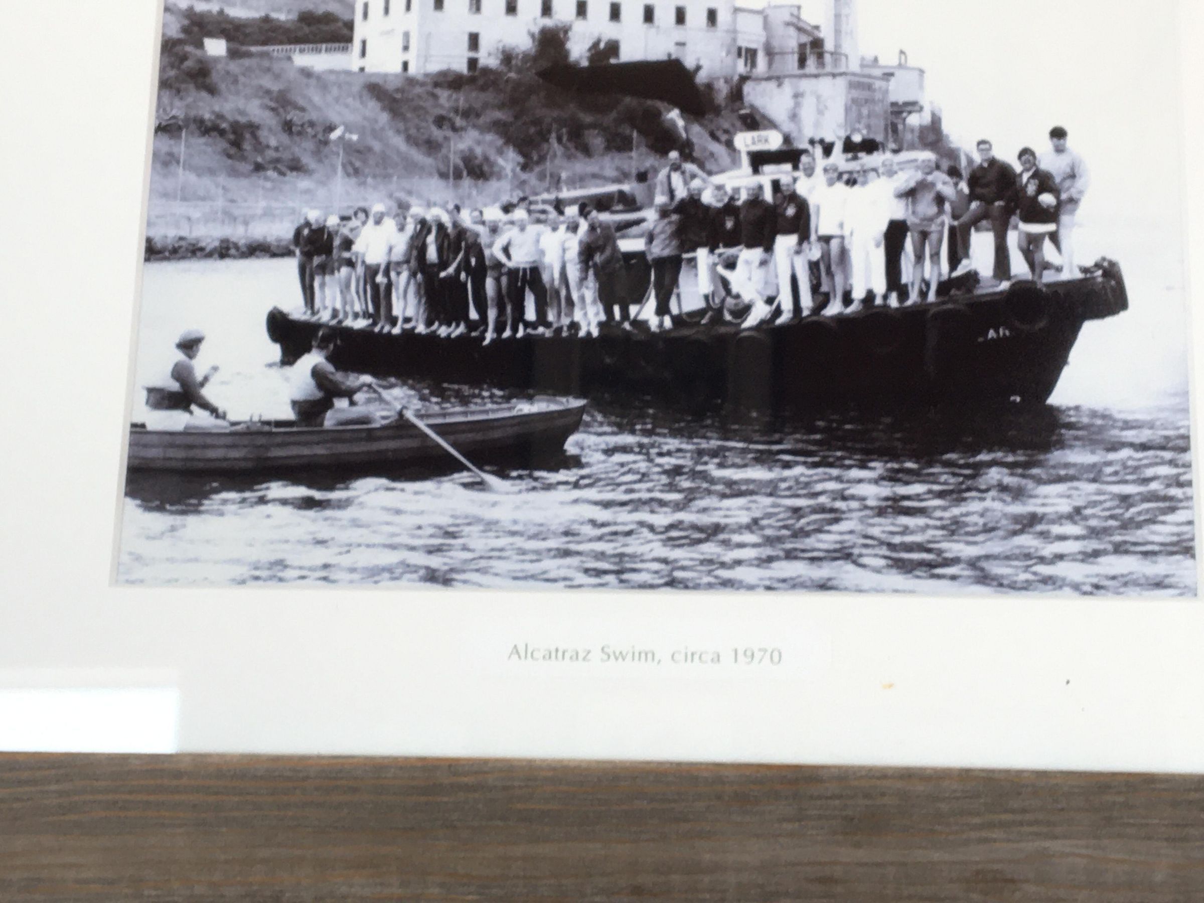 B/W photo of members on boat "LARK" before jump Alcatraz swim.